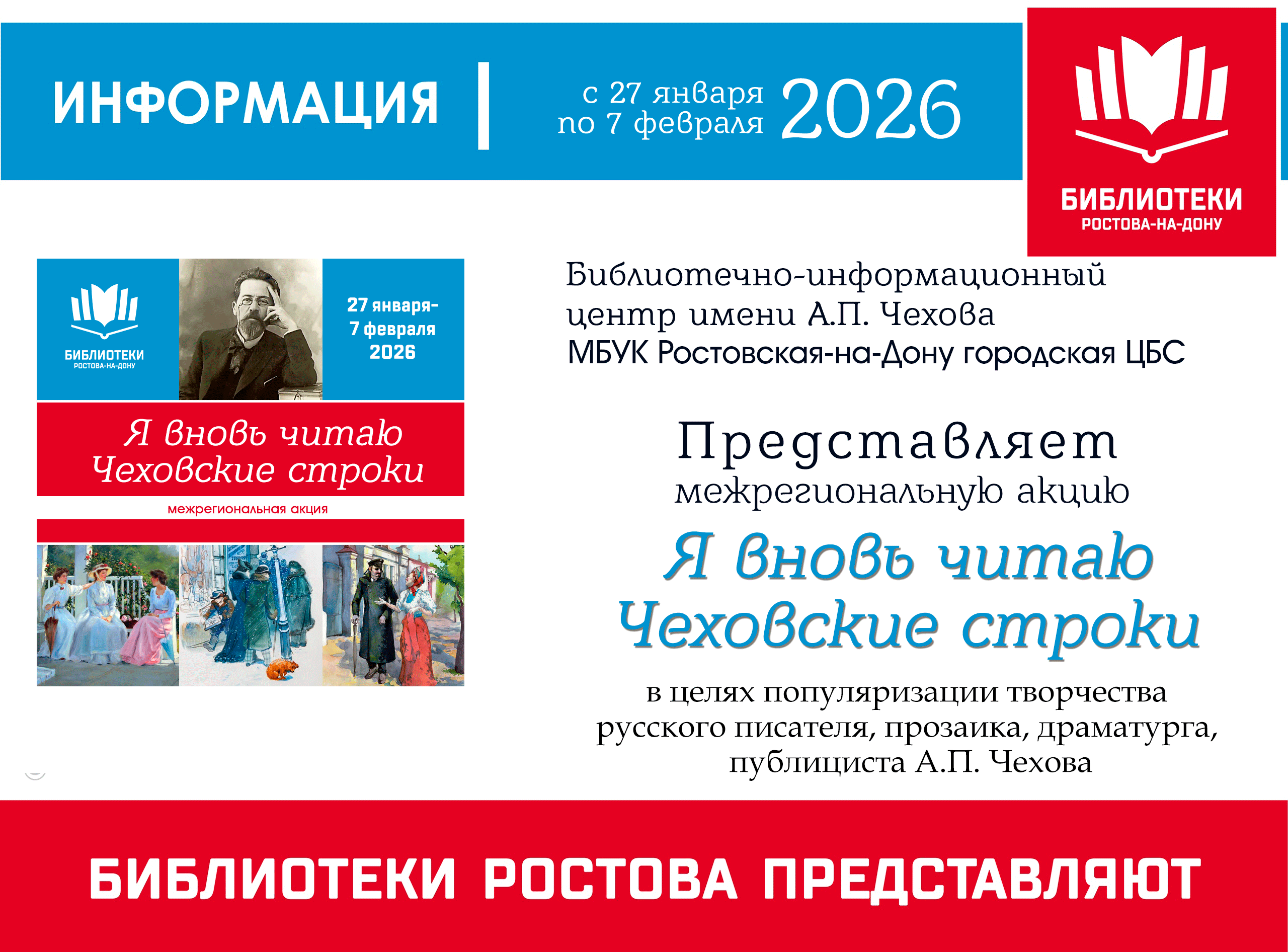 Библиотечно-информационный центр имени А. П. Чехова приглашает принять участие в межрегиональной акции «Я вновь читаю Чеховские строки». Акция проводится с 27 января по 7 февраля 2026 года. Для участия в акции необходимо: - стать подписчиком сообщества «Я вновь читаю Чеховские строки» в социальной сети ВКонтакте; - разместить на странице сообщества «Я вновь читаю Чеховские строки» в социальной сети ВКонтакте краткий отчет о проведенном мероприятии (форма мероприятий определяется самостоятельно участниками ...