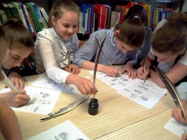 В конце мероприятия дети попробовали себя в каллиграфии, воспользовавшись настоящим гусиным пером и перьевой ручкой.