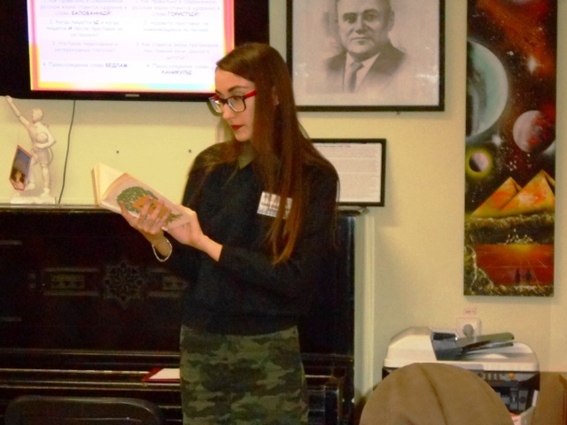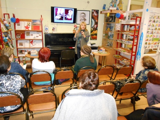 После поздравительных слов заведующая центром в сопровождении электронной презентации рассказала о традиционных и новых формах выставочной деятельности: выставках-инсталляциях, арт-выставках. В презентацию были включены фотографии самых интересных выставок года. Прошла обзорная беседа у мемориального уголка, который пополнился новыми экспонатами: картинами и вымпелами ФКС «Байконур» и РКК «Энергия».