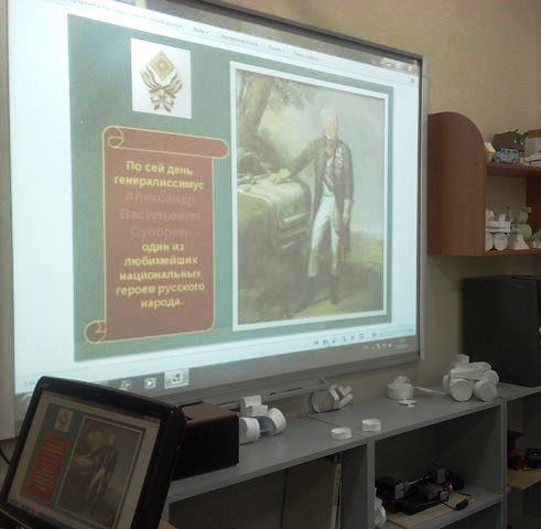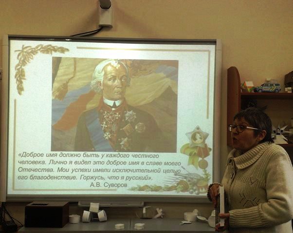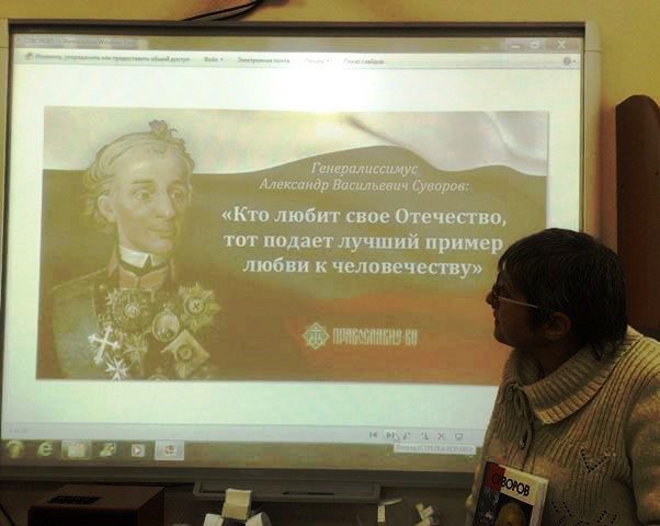 Беседа была проиллюстрирована демонстрацией электронной презентации «Великий русский полководец А. В. Суворов: верность Богу, Царю и Отечеству».