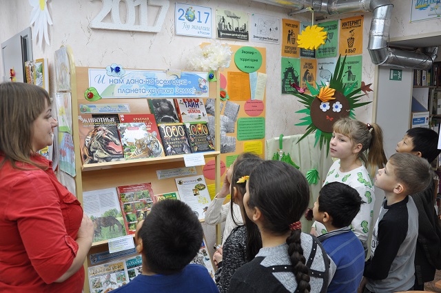 Сотрудники библиотеки представили вниманию детей экологическую книжную выставку «И нам на всех дана одна – планета хрупкая земля». Эпиграфом к выставке являются слова А.И. Герцена «Грандиозные вещи делаются грандиозными средствами. Одна природа делает великое даром».