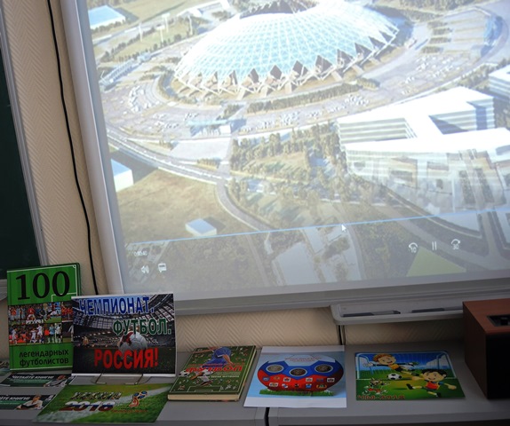 Рассказ библиотекаря сопровождался презентациями «Футбол. Чемпионат мира 2018», «Стадионы России». Демонстрировались видеопрезентации г. Ростова-на-Дону и стадиона «Ростов-Арена».
