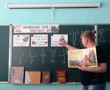Из вступительной беседы "И нравы, и язык, и старина святая" ребята узнали, что 24 мая во всех славянских странах отмечается день славянской письменности и культуры. Затем состоялось громкое чтение книги Е.Перехвальской «Откуда азбука пошла», из которого ребята узнали, что в древности люди обменивались информацией друг с другом посредством рисунка. Это первые шаги человека к созданию письменности. Постепенно от рисунка люди перешли к знакам, которые стали называть буквами. Так зародилась письменность. Затем прозвучал рассказ о братьях Кирилле и Мефодие, об их большом вкладе в создание азбуки, отражающей живую речь. Мы чтим их подвиг во имя света знаний и веры и с благодарностью называем святыми и равноапостольными.