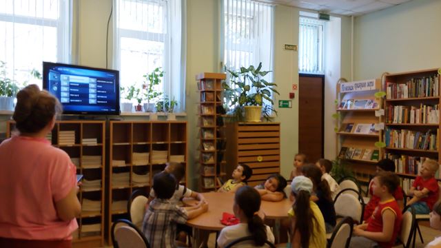 Из электронной презентации «Библиотека» юные читатели узнали, как устроена библиотека, какие существуют способы расстановки книг и как ориентироваться в этом храме книги. Были сделаны выводы о правилах, необходимых, чтобы уберечь книги и библиотеки от случайного вреда. Затем дети посмотрели фрагмент мультфильма «Гришкины книжки», который рассказал, как не надо обращаться с книгами.