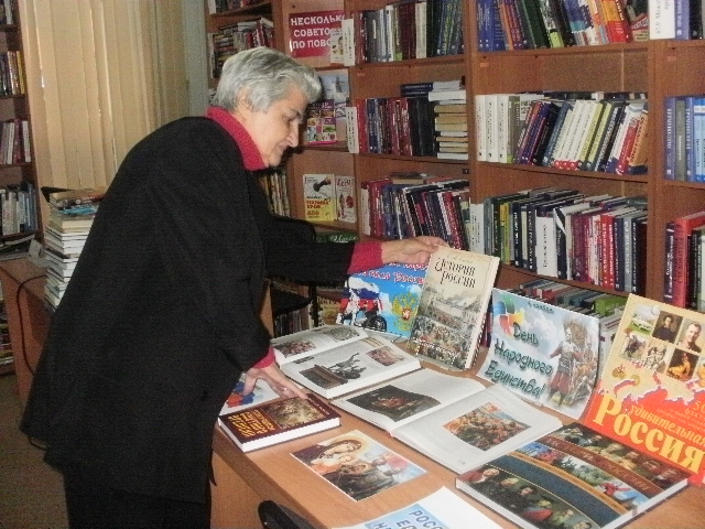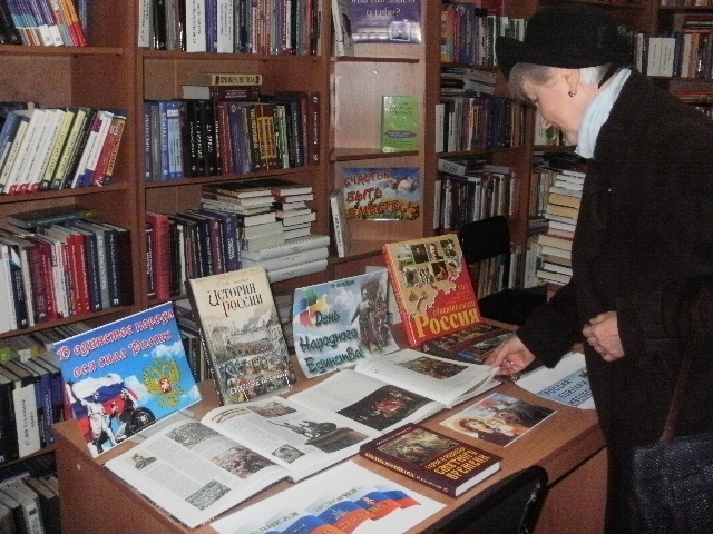 У книжной выставки «В единстве народа вся сила России» были проведены информационный обзор и историческая экскурс-беседа «И поднималась Русь с колен в руках с иконой перед битвой».