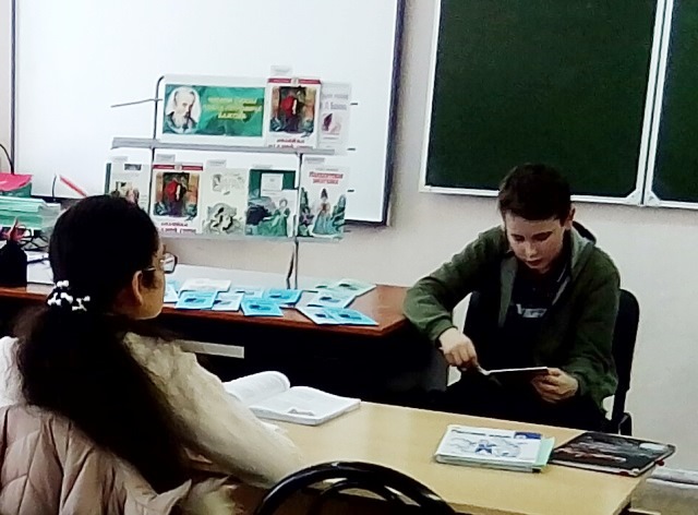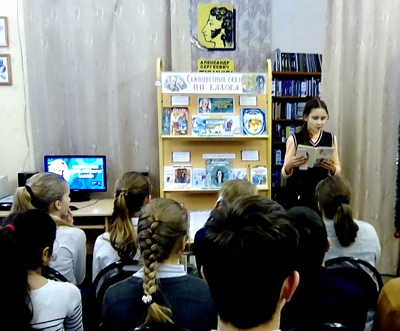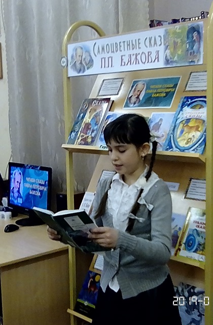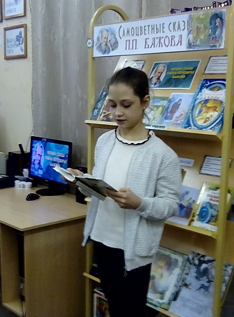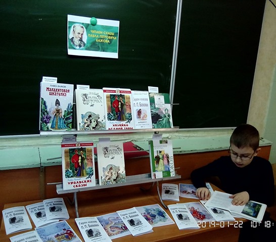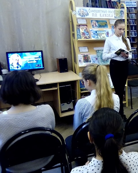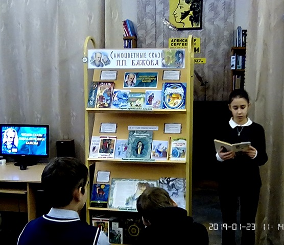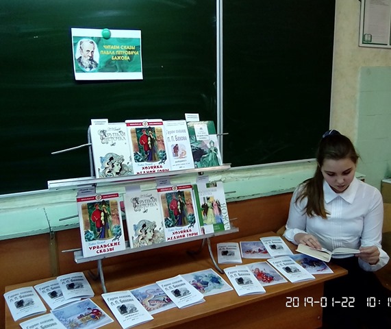 В заключение мероприятия прошел обзор книжной выставки «Самоцветные сказы П.П. Бажова», а на память школьники получили дайджесты «Герои сказов Бажова».