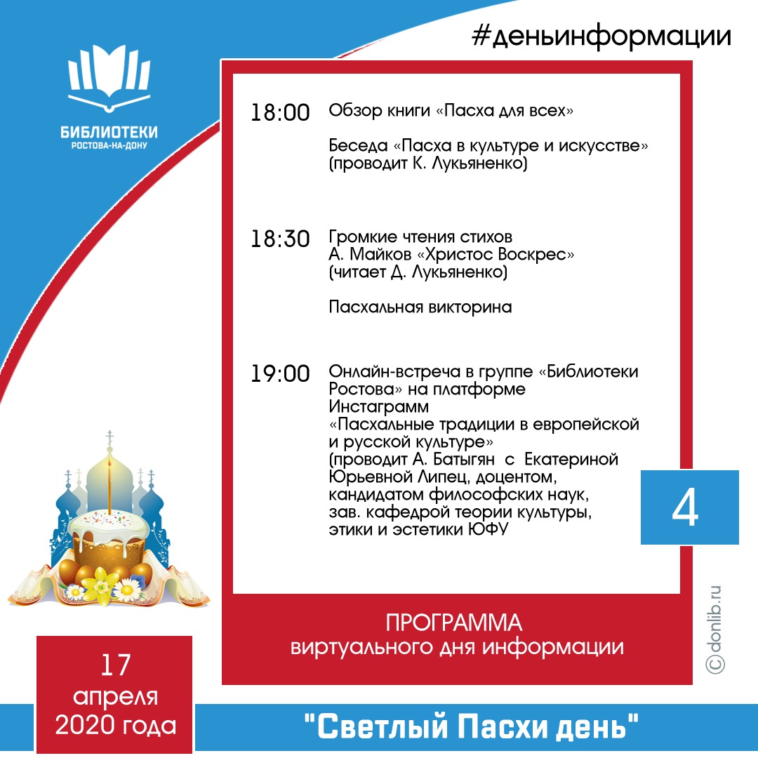 А в 19 часов на нашей странице в сети Инстаграм состоится онлайн-встреча на тему: «Пасхальные традиции в европейской и русской культуре» с участием доцента, кандидатом филосовских наук, зав. кафедрой теории культуры, этики и эстетики ЮФУ Екатериной Юрьевной Липец.