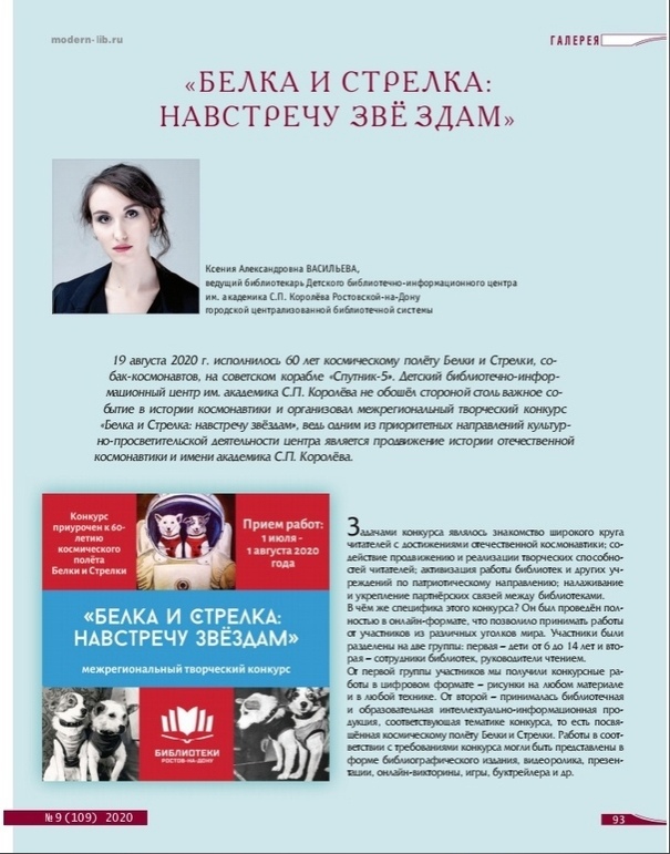 В статье «Белка и Стрелка: навстречу звёздам», опубликованной в №9 журнала «Современная библиотека», ведущий библиотекарь К.А. Васильева делится опытом проведения онлайн-конкурсов и рассказывает о результатах Межрегионального творческого конкурса «Белка и Стрелка: навстречу звёздам», приуроченного к 60-летию космического полёта советских собак-космонавтов.