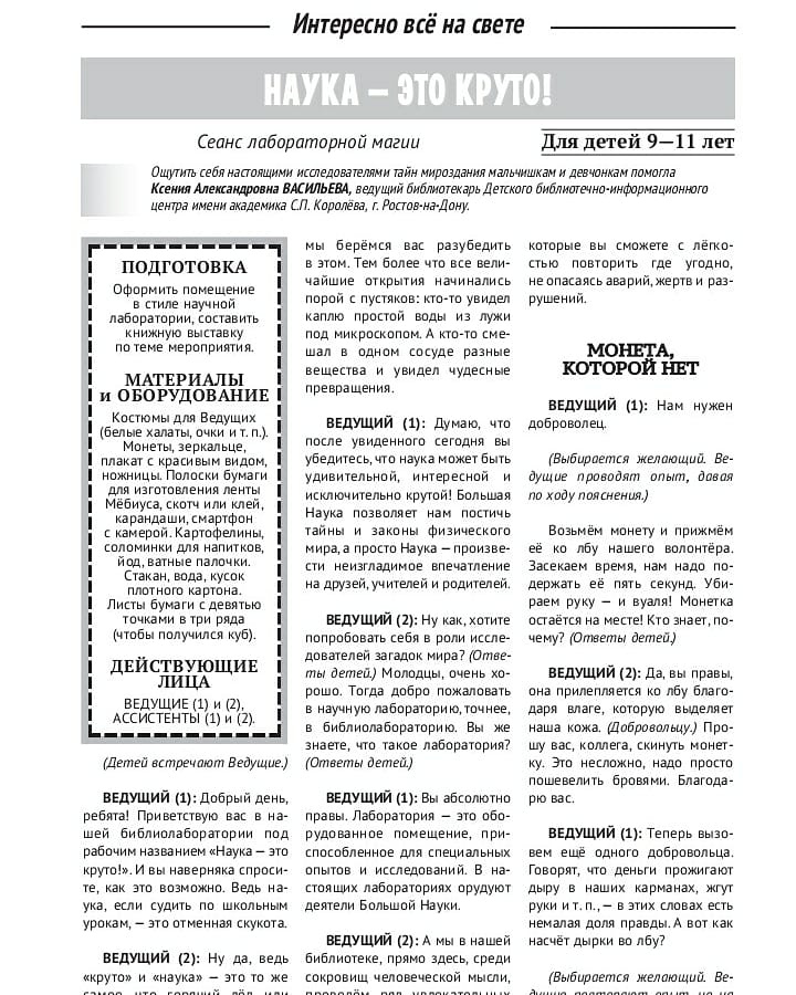 2. Васильева, К.А. Наука – это круто! // Книжки, нотки и игрушки для Катюшки и Андрюшки. – 2020. – №12. – С. 56-60.