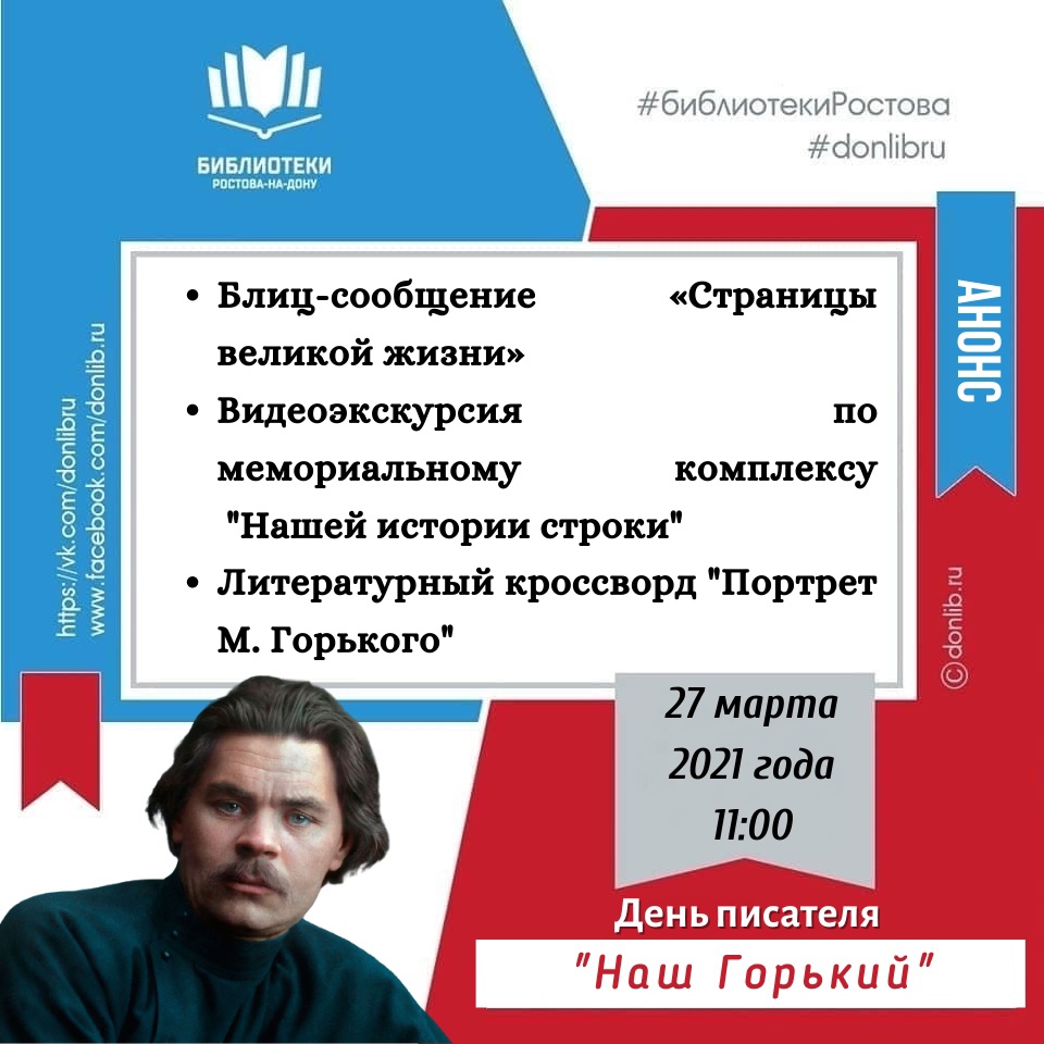 27 марта в 11:00 в блоге Абонемента Центральной городской библиотеки имени М.Горького состоится виртуальный День писателя «Наш Горький», приуроченный к 153-й годовщине известного писателя А.М. Горького.