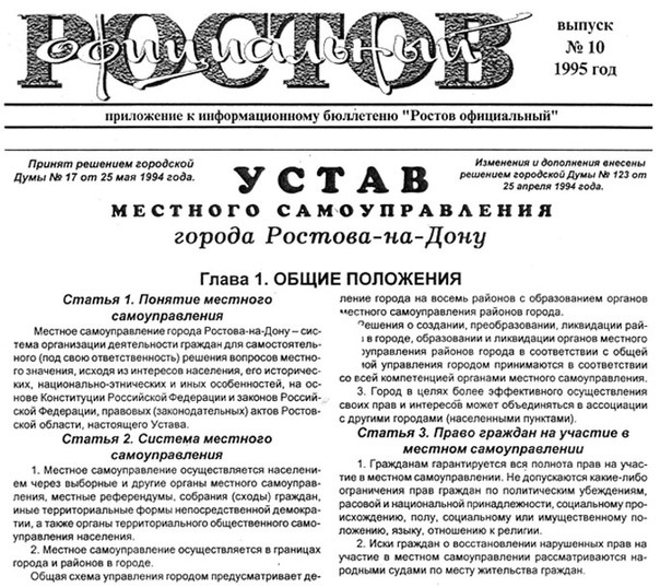 Основные направления деятельности городской власти определены Уставом города, принятым решением Ростовской-на-Дону городской Думы №211 от 9 апреля 1996 года, с изменениями, внесенными в 1997–1998 г.г. Именно Устав города определяет, какие органы составляют местную систему управления, как эти органы формируются, какова их компетенция. Эти положения и закрепляет Устав города Ростова-на-Дону, принятый на базе и в развитие Федерального закона от 06.10.2003 №131-ФЗ «Об общих принципах организации местного самоуправления в Российской Федерации».