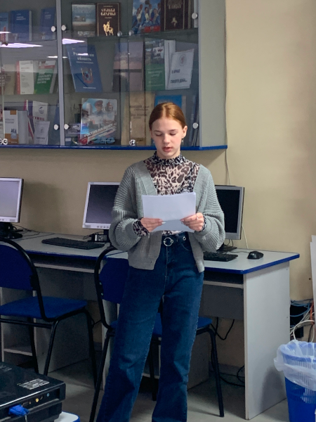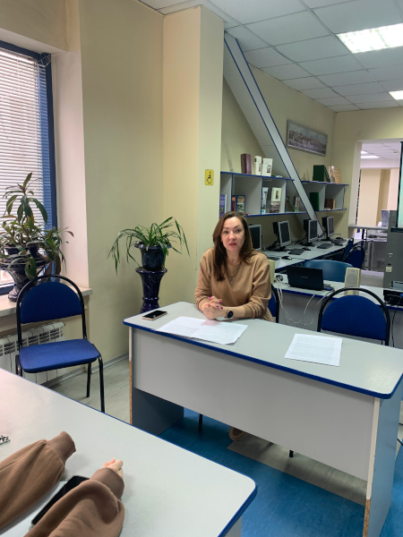 Заведующая библиотекой им. А. В. Калинина А. А. Попова осветила перед студентами проблему чтения книг в современном обществе, а также рассказала о возможности участия в творческих процессах.