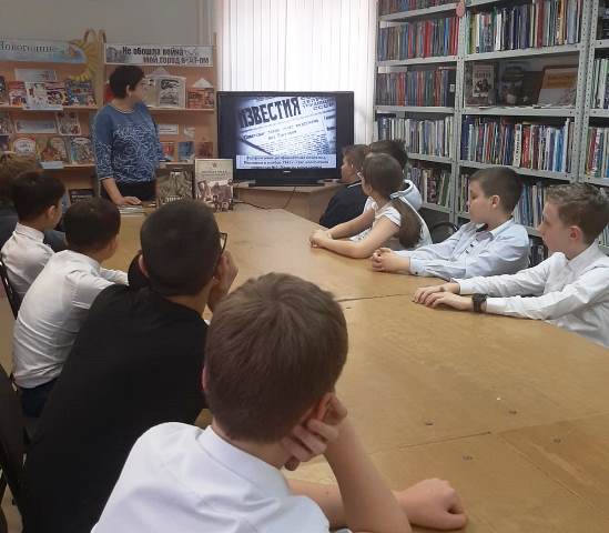Накануне 82 годовщины 1-го освобождения города Ростова-на-Дону от немецко-фашистских захватчиков в детской библиотеке имени Ильича МБУК Ростовская-на-Дону городская ЦБС для ребят МБОУ «Школа №21» 5 В класса был проведён час мужества «Бессмертный подвиг земляков».