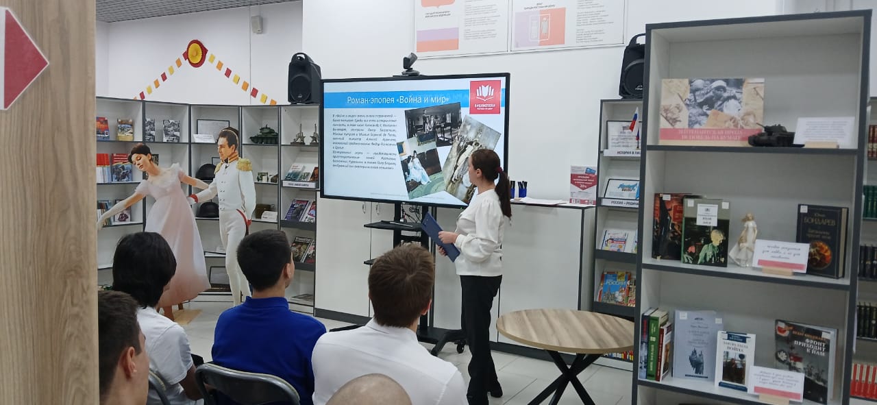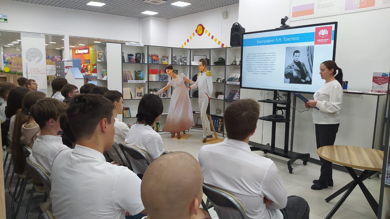 В ходе мероприятия ученики 10-го класса МБОУ «Школа №75» познакомились с интересными фактами из жизни Л. Н. Толстого, его литературной деятельностью и историей написания знаменитого романа – эпопеи «Война и мир».