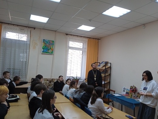 Священник рассказал школьникам о Библии; заповедях, содержащихся в книгах Ветхого и Нового Завета. Иерей Дионисий актуализировал исполнение заповедей в современной жизни и ответил на вопросы молодых людей, участвовавших во встрече.