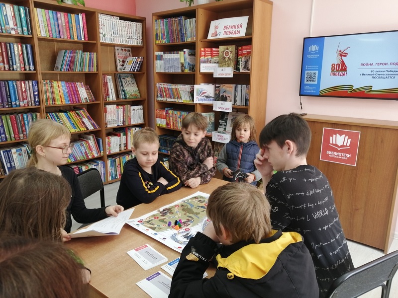 Участники – ребята от 10 до 12 лет, познакомились с книжной выставкой «Как ковалась победа», почитали стихи о войне, а позже соревновались, стремясь как можно быстрее достичь финишной клетки игрового поля. Продвижение по маршруту зависело от правильных ответов на вопросы из специальных карточек, охватывающих историю России, известные военные песни и фильмы, подвиги воинов и знаменитые сражения.