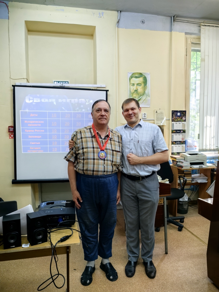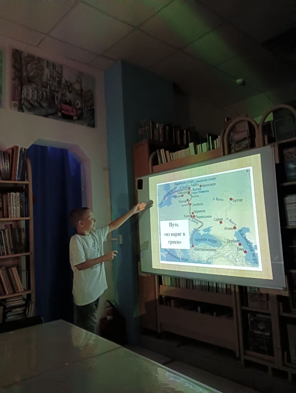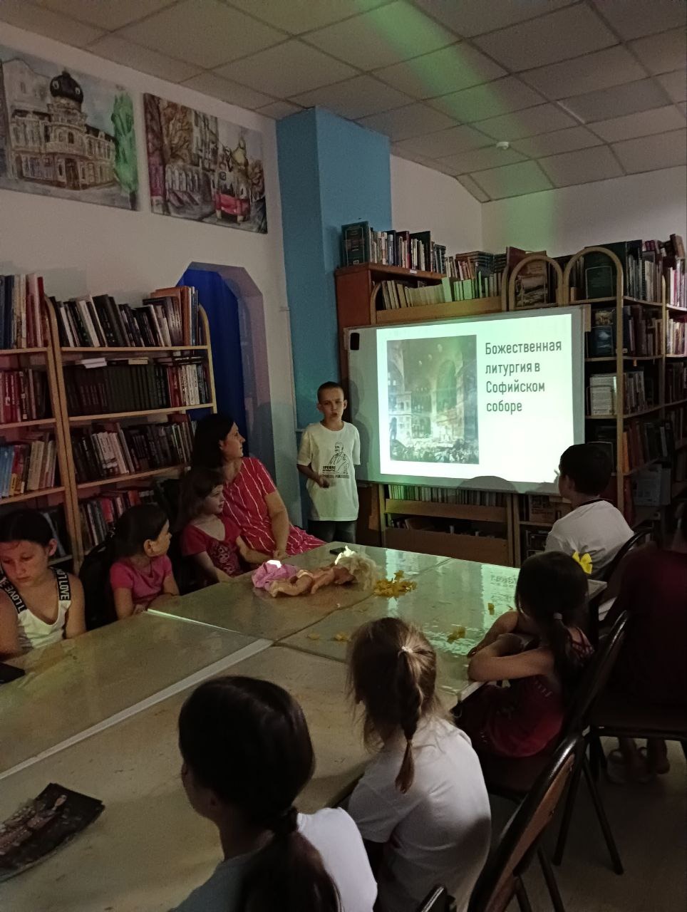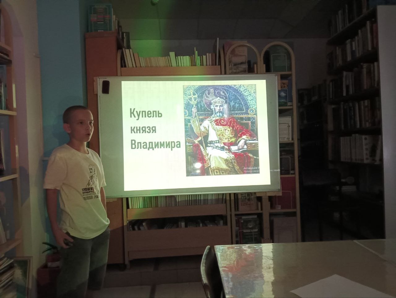 Далее ребята послушали доклад Николая Волощукова, постоянного читателя библиотеки, любителя и знатока истории России. Николай поведал слушателям о становлении христианства на Руси, от апостольских времён до купели князя Владимира, объединившего русский народ крещением во Христа.