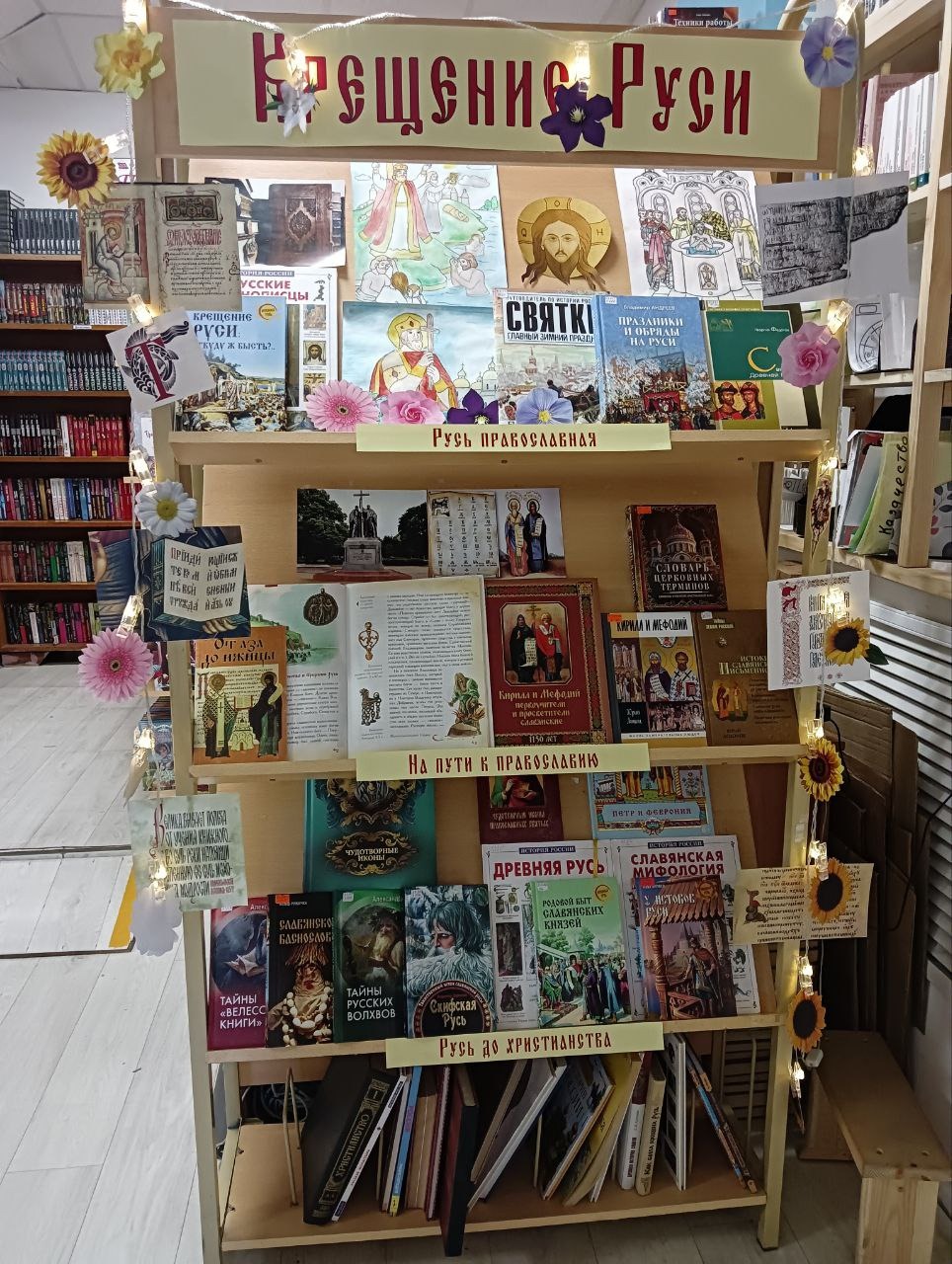 Для того, чтобы разнообразить мероприятие и вовлечь ребят в создание атмосферы, библиотекари подготовили книги и оформление книжной выставки. Рисунки и иллюстрации, элементы декора и гирлянда - все это дизайнерское разнообразие вошло в выставку о Крещении Руси, собранную юными читателями самостоятельно.
