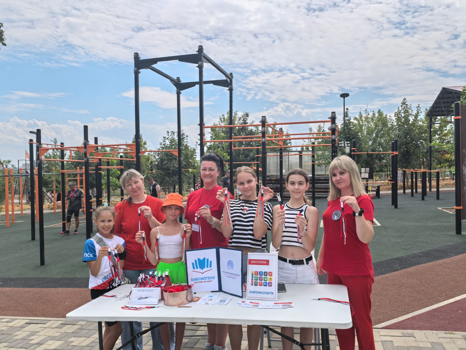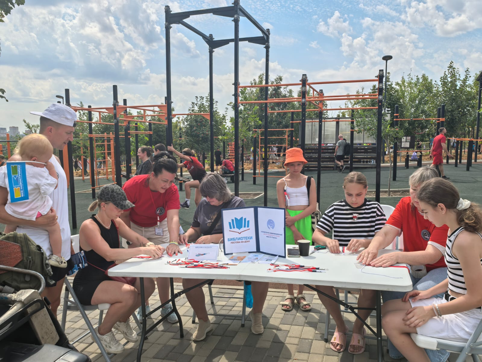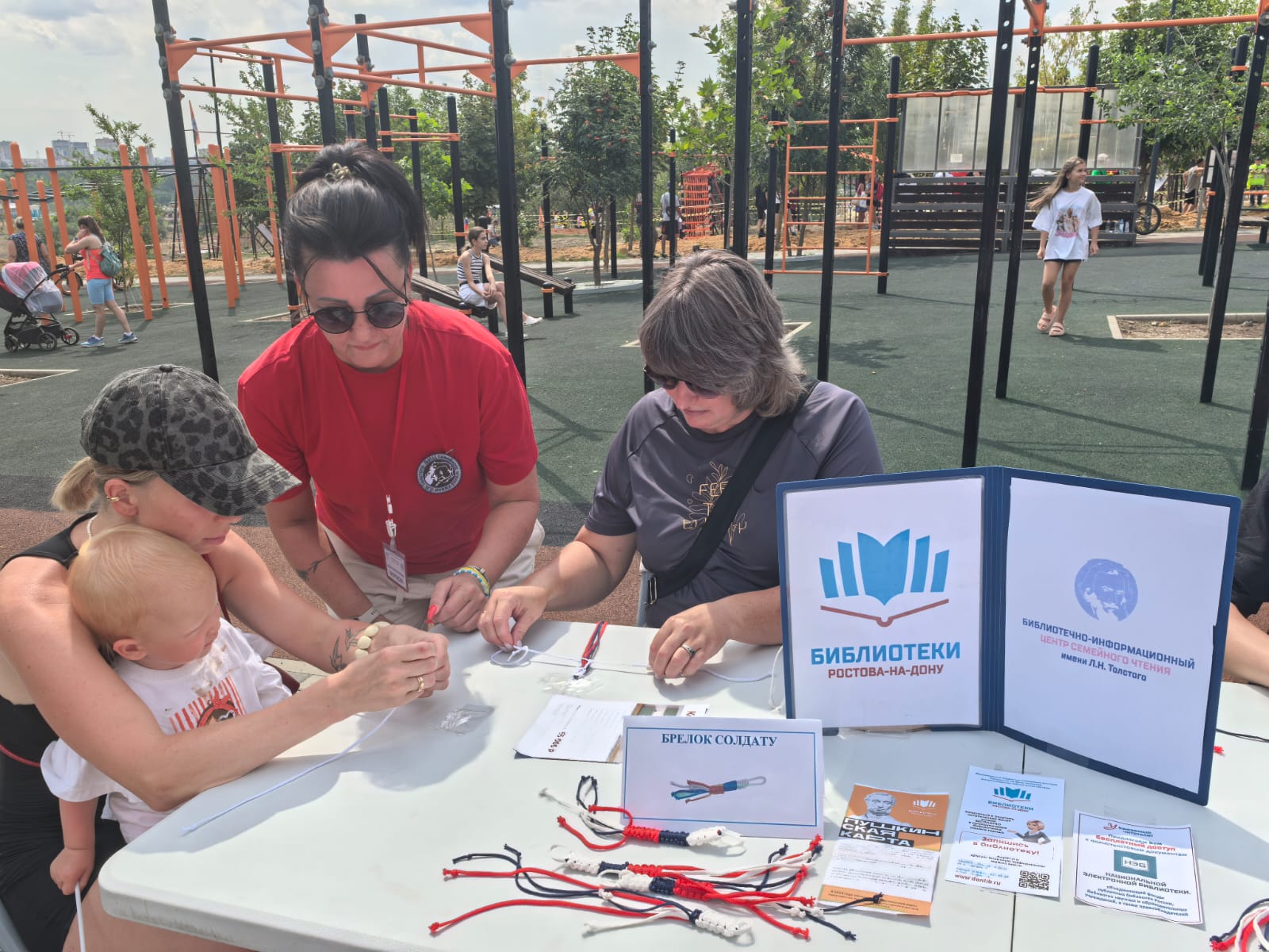 В День физкультурника специалисты Библиотечно-информационного центра семейного чтения имени Л. Н. Толстого приняли участие в проведении мастер-класса «Браслет солдату» и викторины «Знатоки спорта» в парке «В честь 70-летия Победы в ВОВ» во время проведения «ЦАРЬ Гонки».