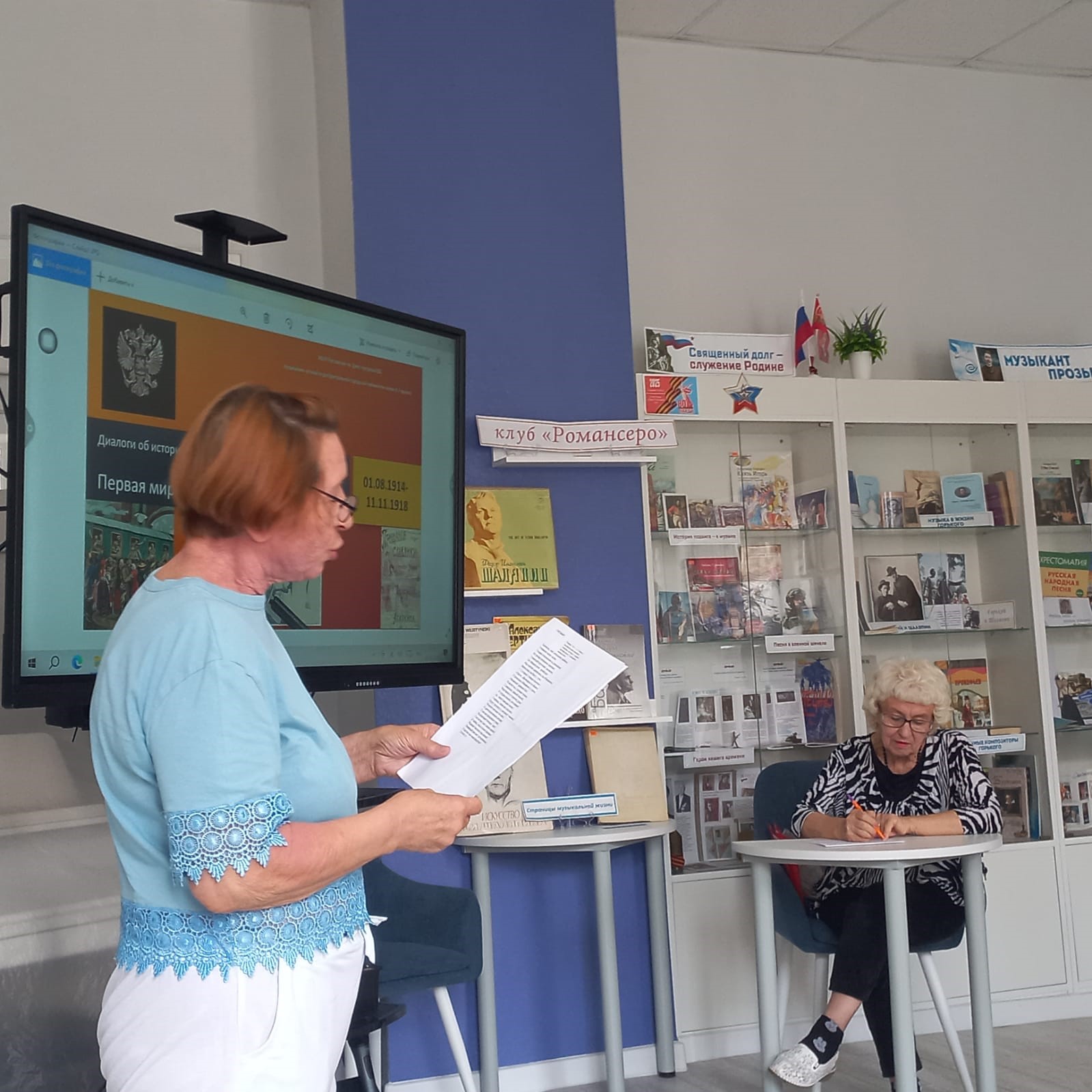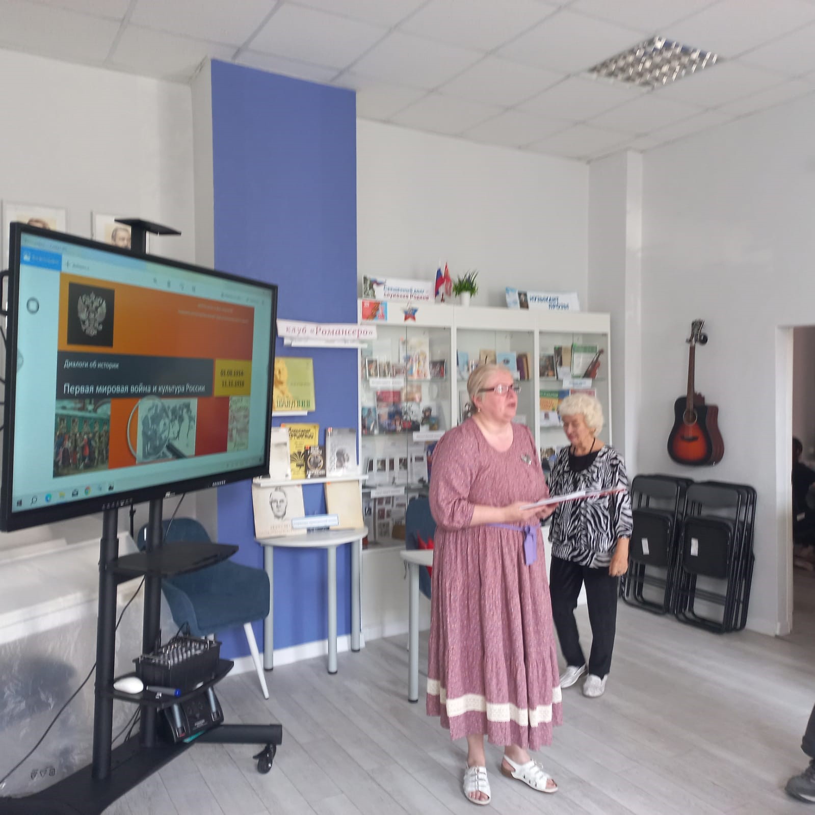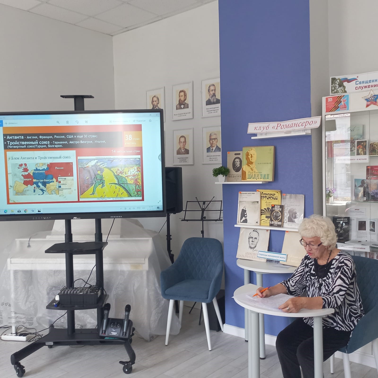 Заведующая музыкально-нотным отделом Центральной городской библиотеки имени М. Горького подготовила презентацию «Первая мировая война и культура России». Вместе с председателем клуба Людмилой Николаевной Донской озвучили страницы истории, цифры статистики, а также участники клуба в диалоговой форме высказали своё мнение об исторических параллелях.