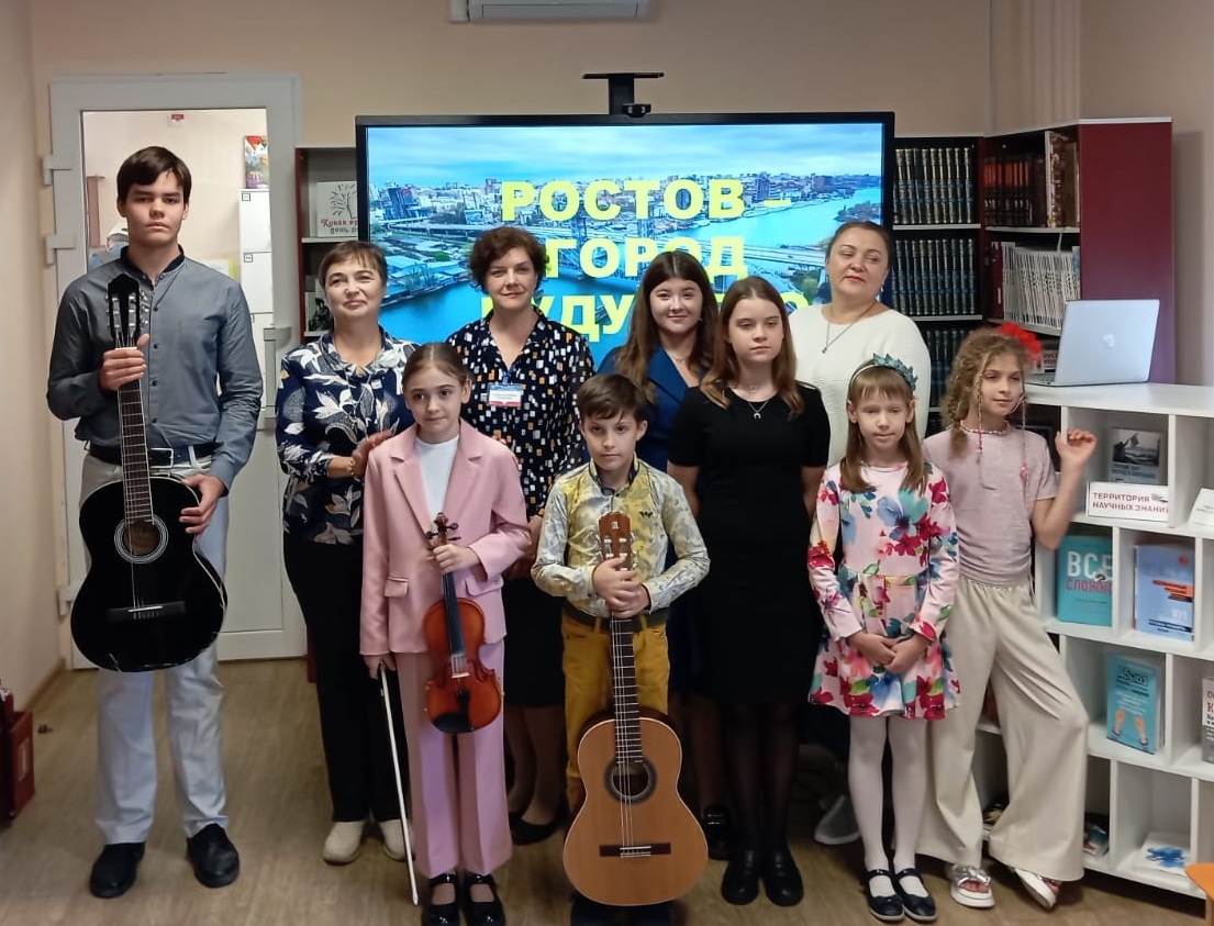 В рамках Дня информации в Краеведческом БИЦ имени М. А. Шолохова состоялась литературно-музыкальная программа «Ростову посвящается». В мероприятии приняли участие учащиеся и педагоги МБУДО ДШИ №7 имени Г.М. Балаева. Присутствующие вспомнили достопримечательности родного города, проявили активность в игре «Доскажи словечко». Библиотекарь познакомила участников мероприятия с книгами и фотоальбомами о родном крае, которые вызвали яркий интерес и гордость за свою малую родину, желание больше узнать о своем городе. Все с удовольствием отвечали на вопросы викторины «Это мой город». Концерт, посвященный Дню рождения Ростова-на-Дону, был замечательным! Дети играли на музыкальных инструментах, пели песни о родном городе. Праздничное настроение для всех обеспечено!
