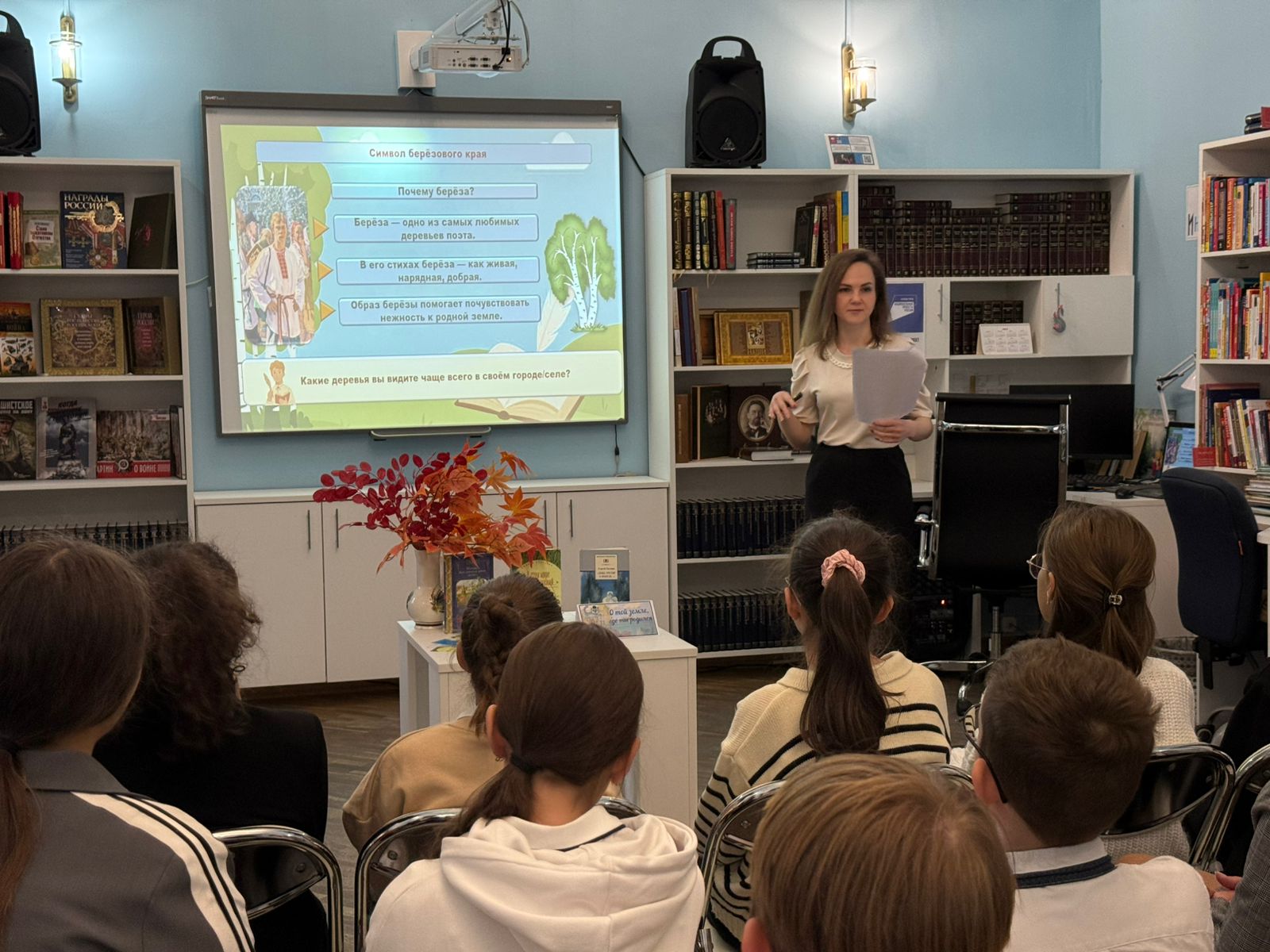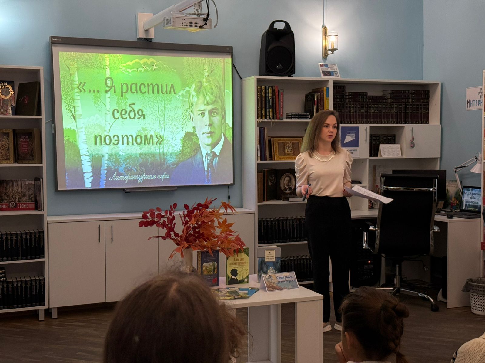 Далее ребята приняли участие в литературной игре, в ходе которой дети должны за определенное время по иллюстрации назвать стихотворение и прочитать его. Участники внимательно рассматривали каждую деталь, пытаясь угадать, какое стихотворение скрывается за этим изображением. Звучали лирические строки его стихотворений «Белая берёза», «Черёмуха», «Пороша», «Отговорила роща золотая…».