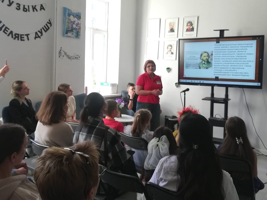 В начале мероприятия специалист библиотеки рассказала о развитии музыкального образования в России второй половины ХIX — первой половины XX вв., показала гостям и участникам презентацию «Музыкально-педагогическая школа (ХIX-ХХ век)».