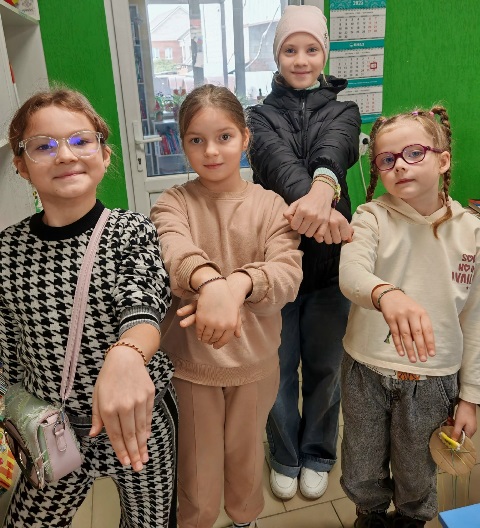 Разнообразная цветовая гамма ниток «мулине» позволила создать яркие шнуры-браслетики, которые ребята тут же примерили.