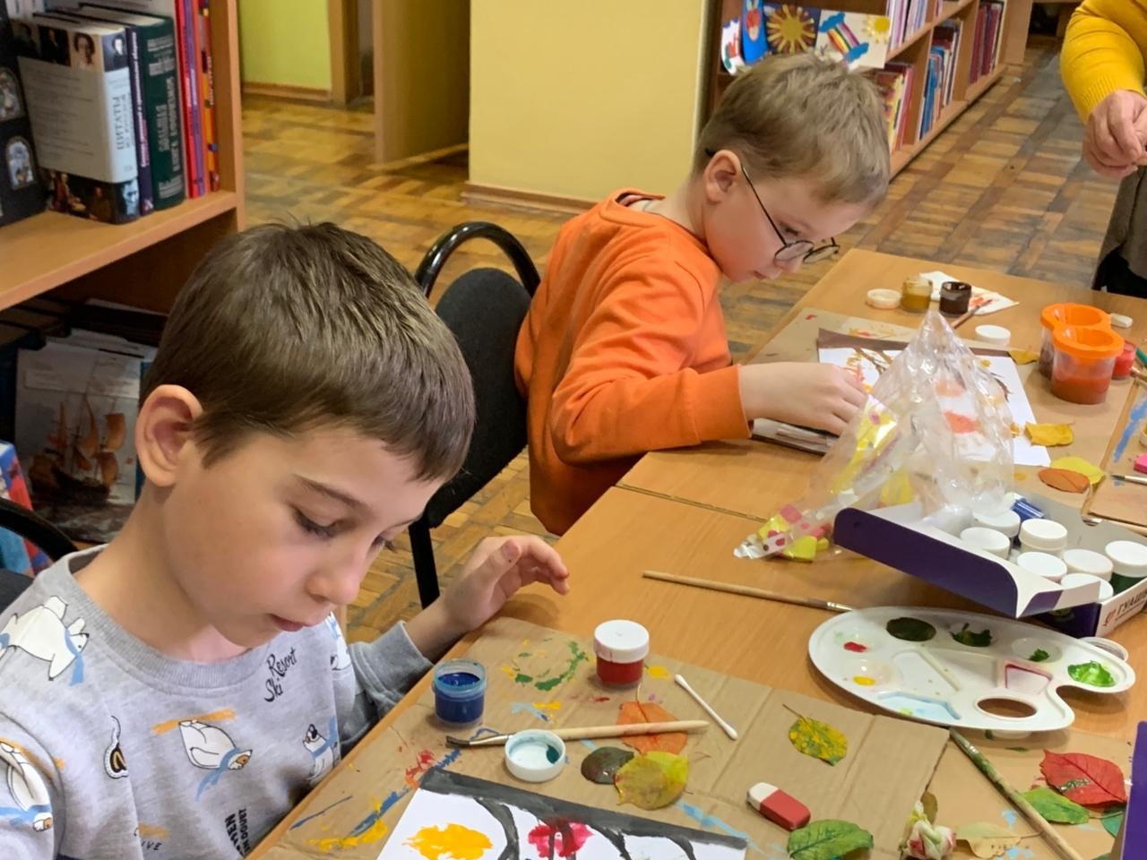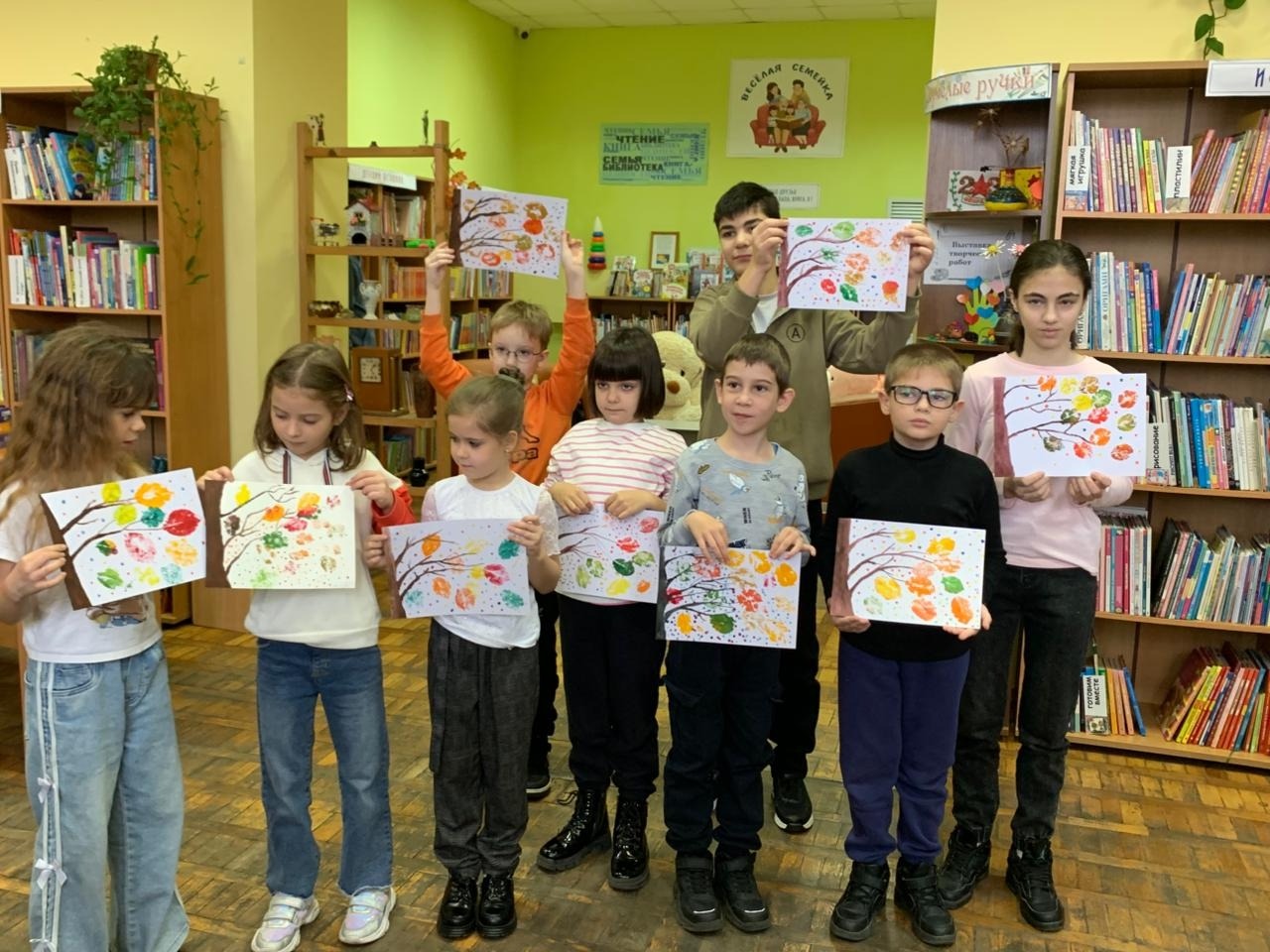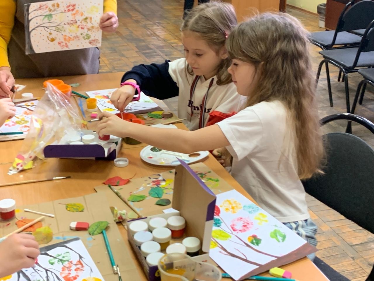 В детской библиотеке имени Зои Космодемьянской участники клуба «Кисточка и карандаш» тоже устроили настоящий листопад. Только этот листопад ребята изобразили на своих рисунках. В рисовании использовались нетрадиционные техники - штампование с помощью листьев деревьев и тычкование ватными палочками. Дети проявили своё воображение и отпечатали листья самых необычных цветов – от жёлтого до малинового. Рисунки получились очень яркими, но несмотря на это, вызывали грусть – уходит год. Скоро в воздухе закружат снежинки, природа уснёт до весны…