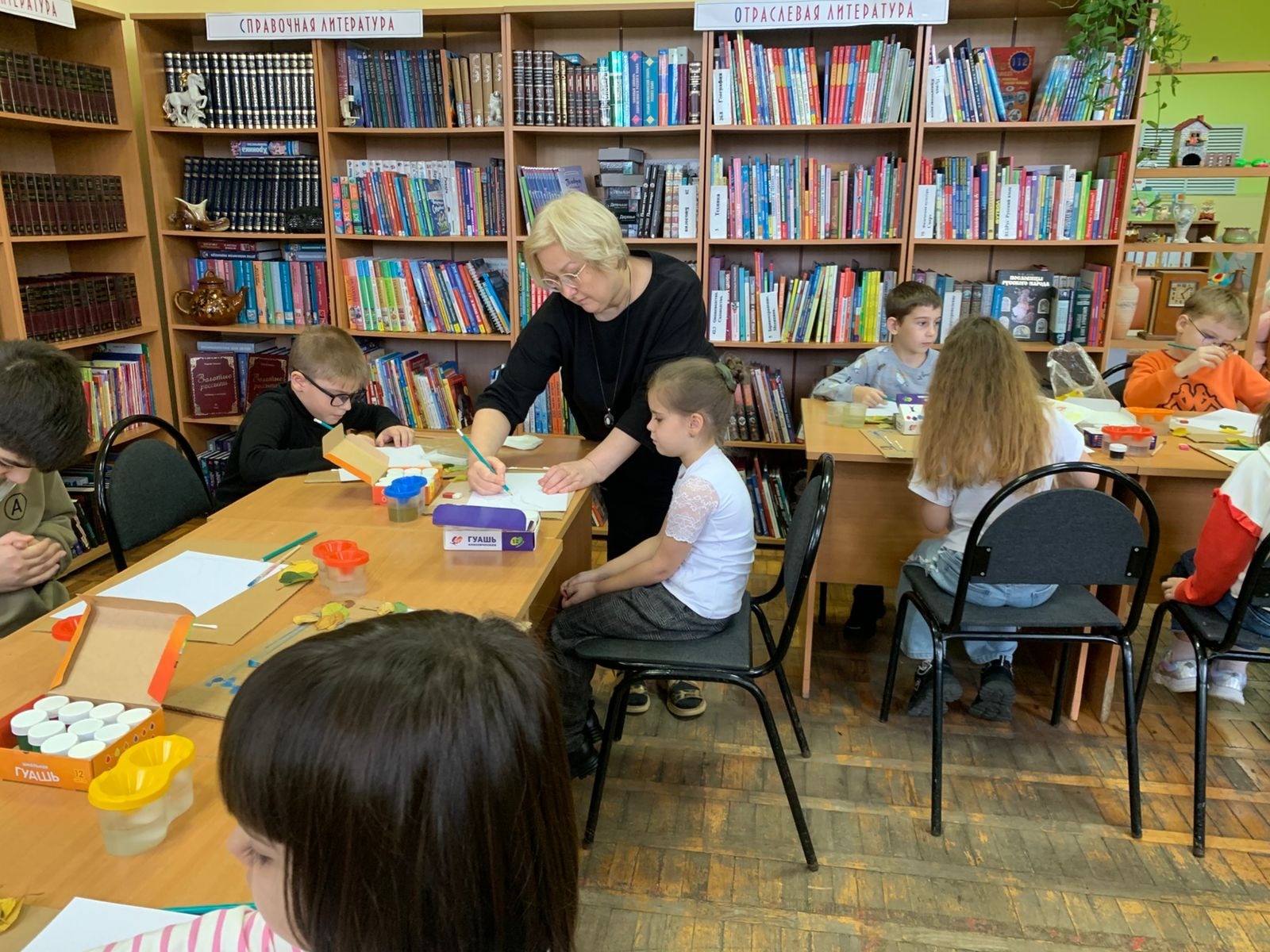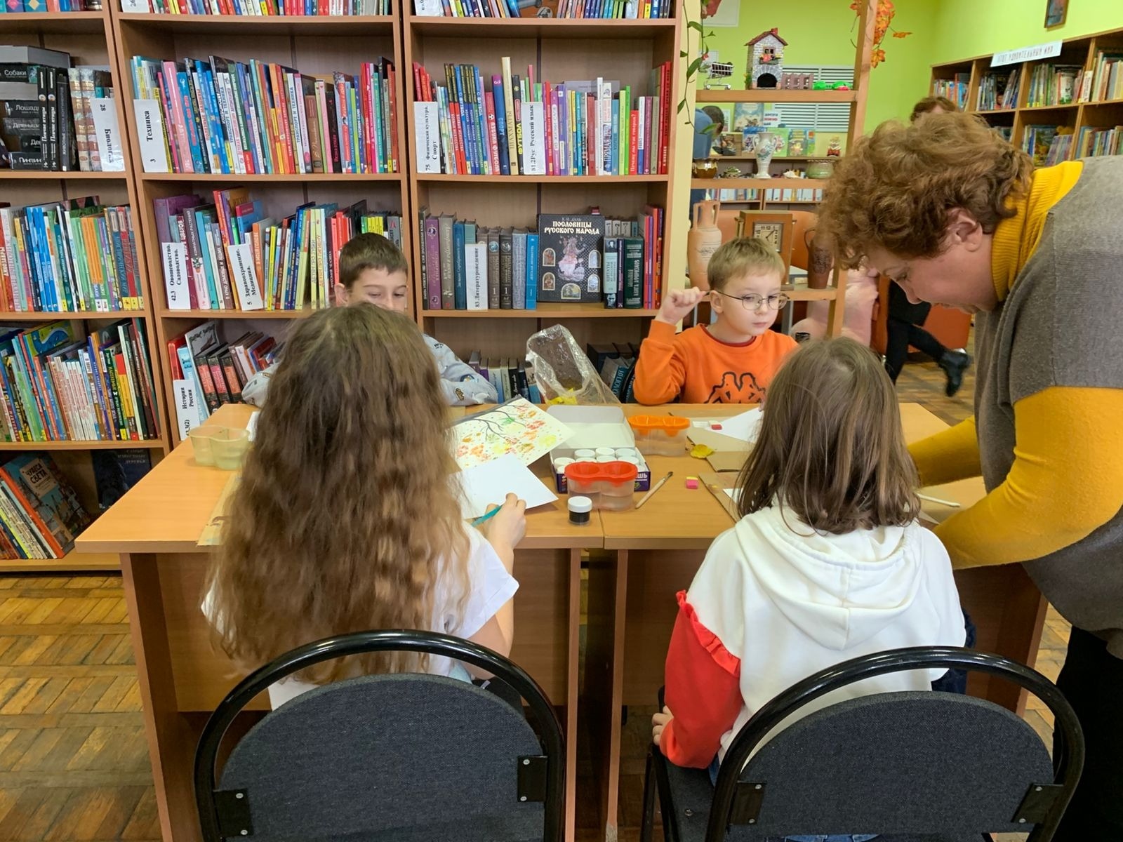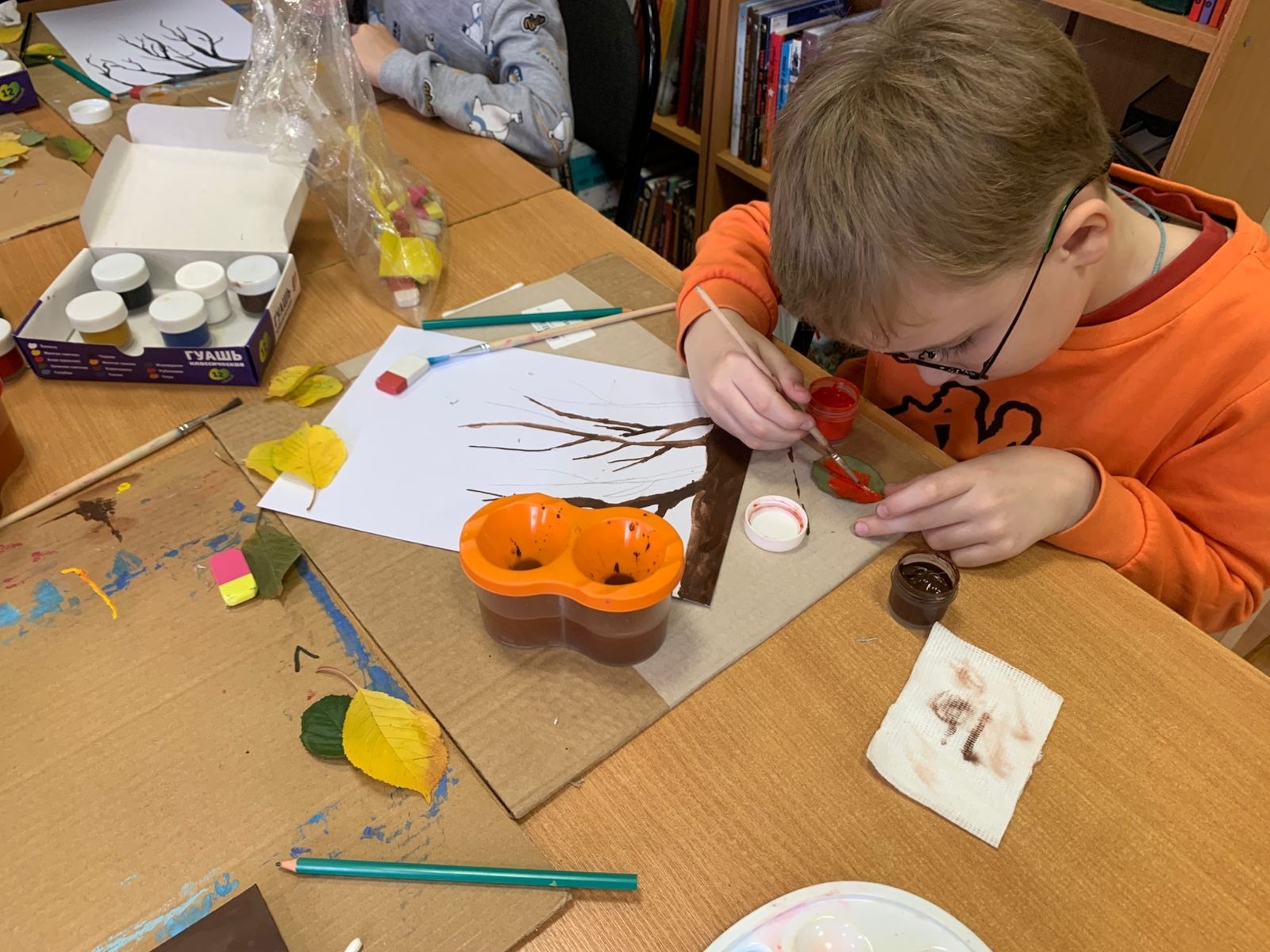 В детской библиотеке имени Зои Космодемьянской участники клуба «Кисточка и карандаш» тоже устроили настоящий листопад. Только этот листопад ребята изобразили на своих рисунках. В рисовании использовались нетрадиционные техники - штампование с помощью листьев деревьев и тычкование ватными палочками. Дети проявили своё воображение и отпечатали листья самых необычных цветов – от жёлтого до малинового. Рисунки получились очень яркими, но несмотря на это, вызывали грусть – уходит год. Скоро в воздухе закружат снежинки, природа уснёт до весны…