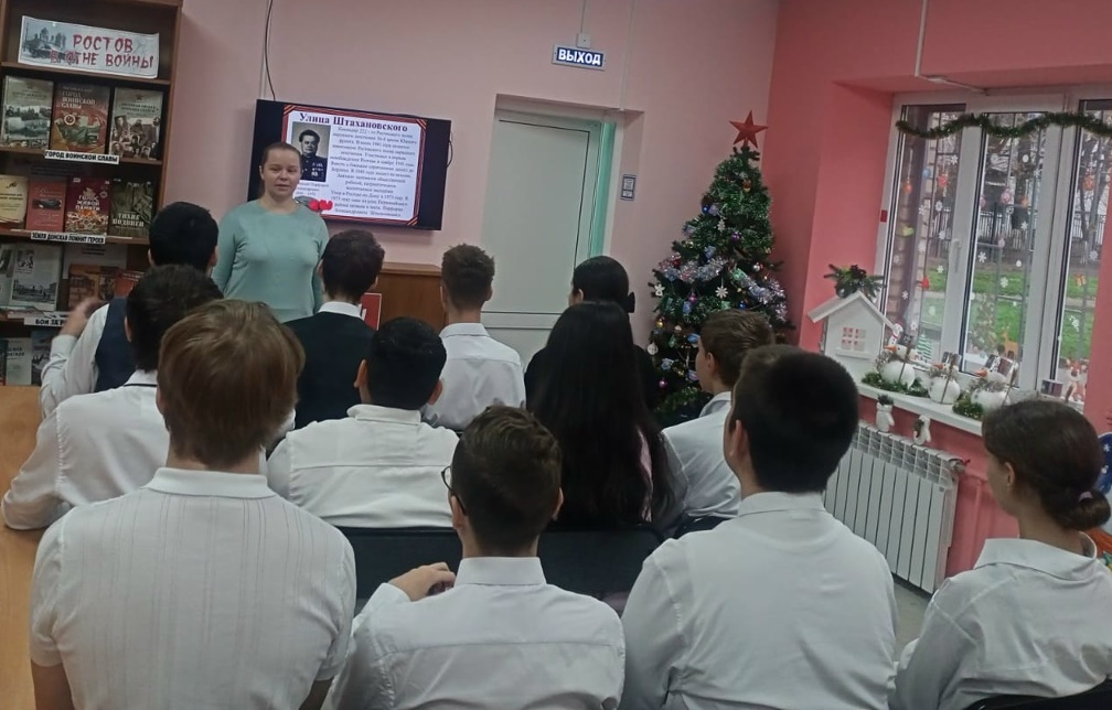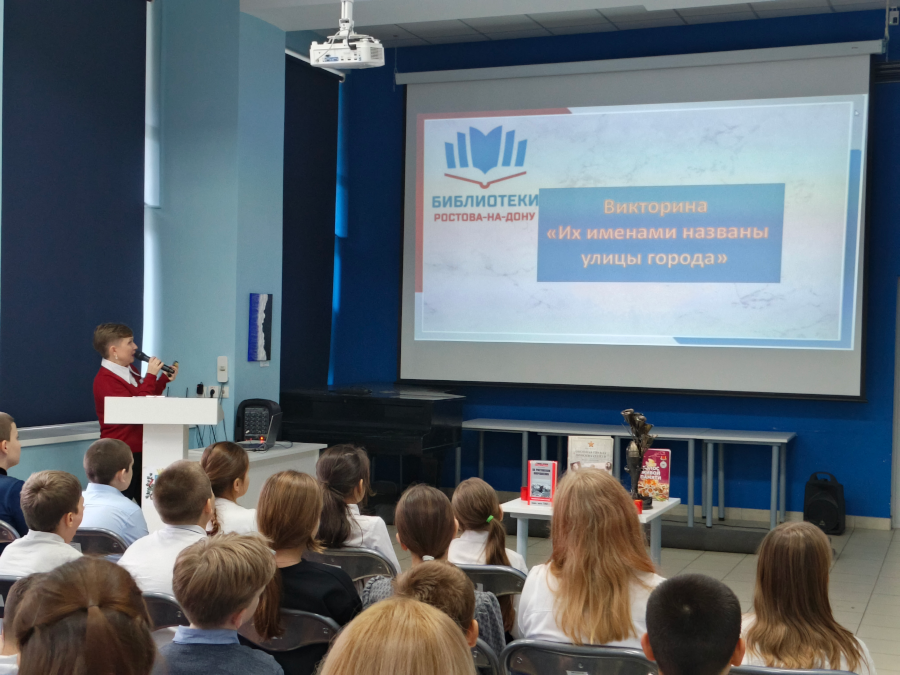 Учащиеся приняли участие в викторине «Имена героев в названиях улиц Ростова», посвященной героям, защищавшим Ростов, в честь которых названы многие улицы нашего города. Особое внимание было уделено П. А. Штахановскому, именем которого названа улица, на которой находится школа и библиотека.