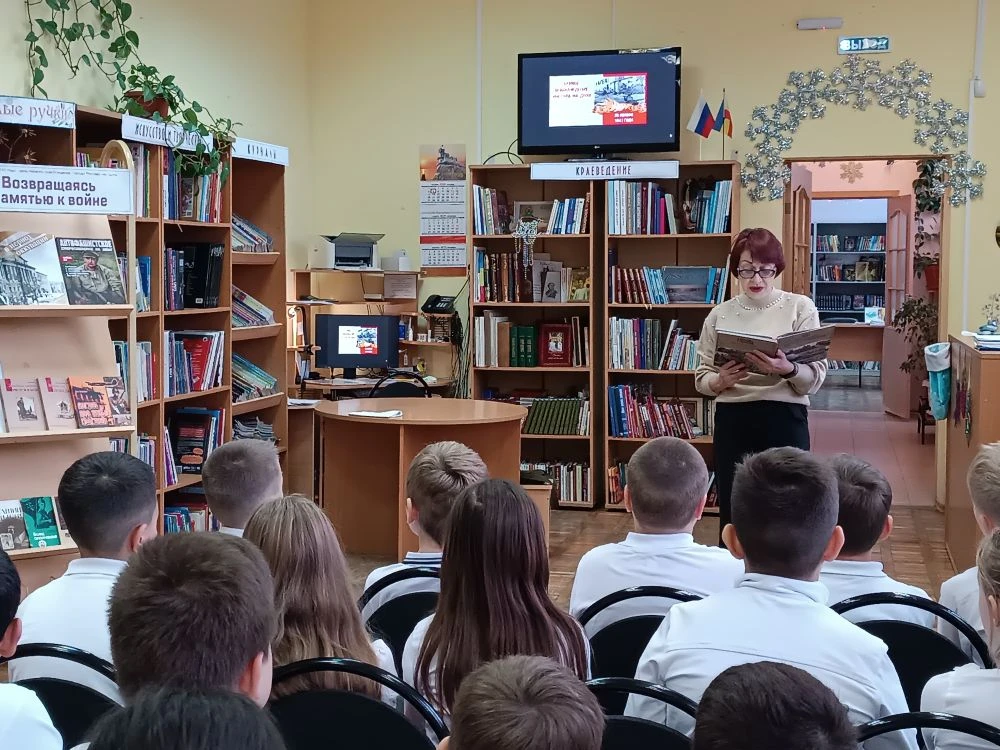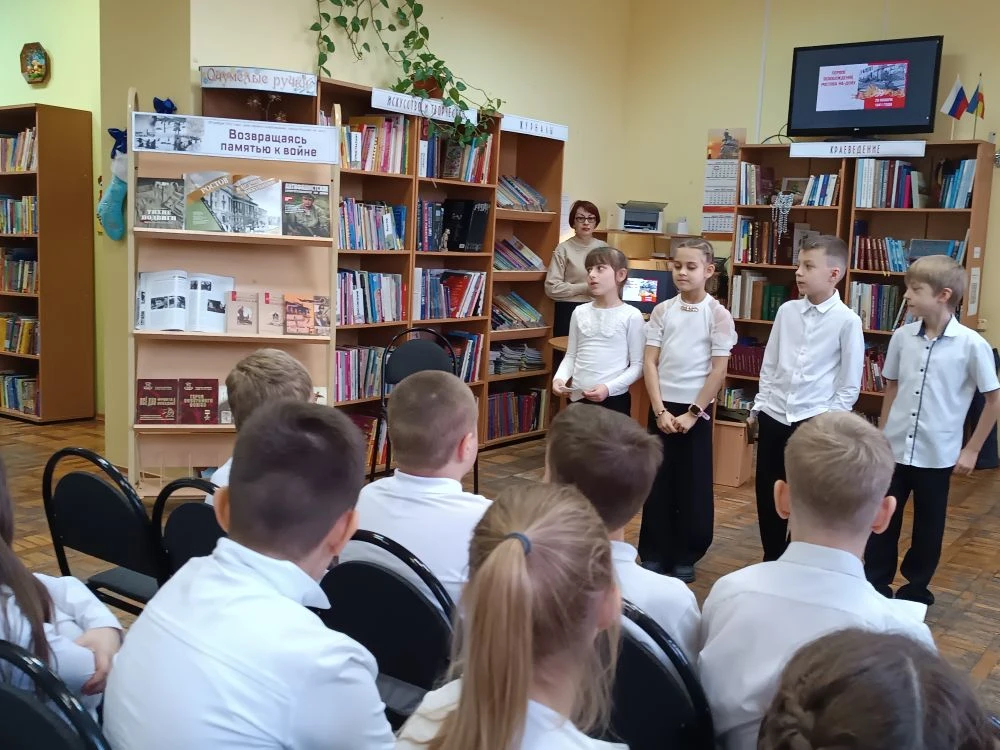 В преддверии памятной даты - первого освобождения Ростова-на-Дону от немецко-фашистских захватчиков для учащихся 3 «С» и 4 «К» классов МБОУ Школа 75 в Библиотечно-информационном центре семейного чтения имени Л. Н. Толстого был проведен патриотический час «Бессмертный подвиг земляков».
