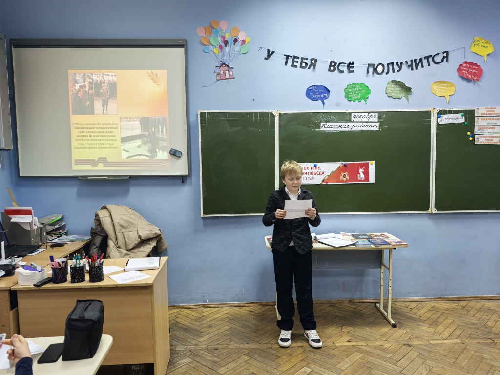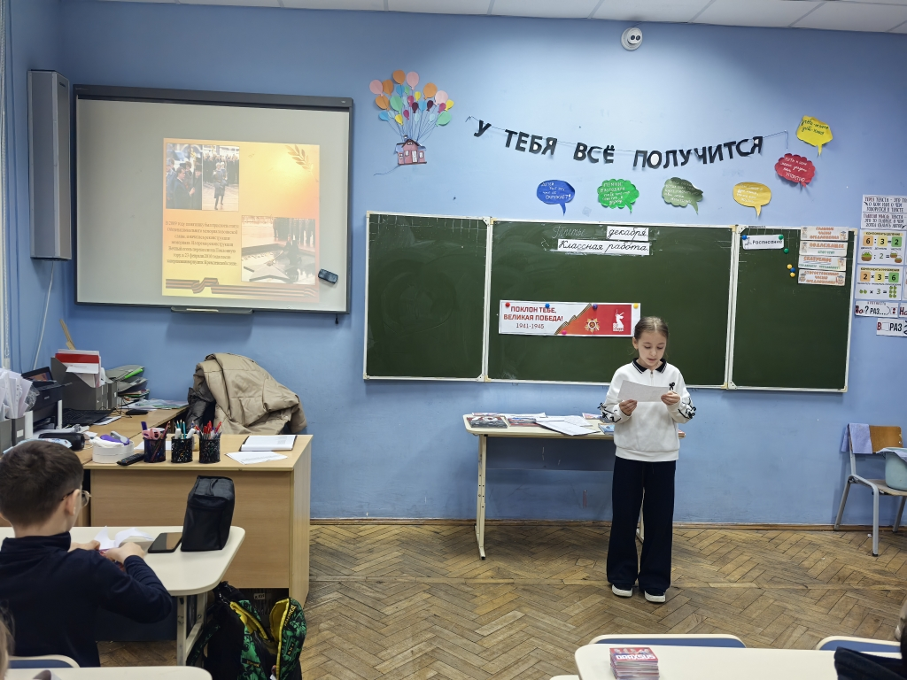 Далее ведущие предложили вниманию обучающихся видеопрезентацию «День Неизвестного солдата», из которой дети узнали о могиле Неизвестного солдата в Москве и что огонь был доставлен из Ленинграда. Специалисты также рассказали, что в 2009 году памятнику был присвоен статус общенационального мемориала воинской славы.