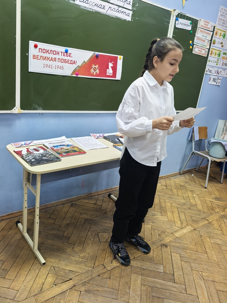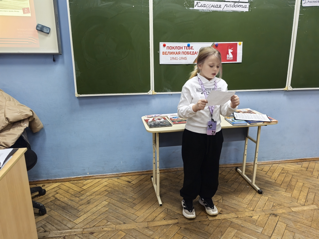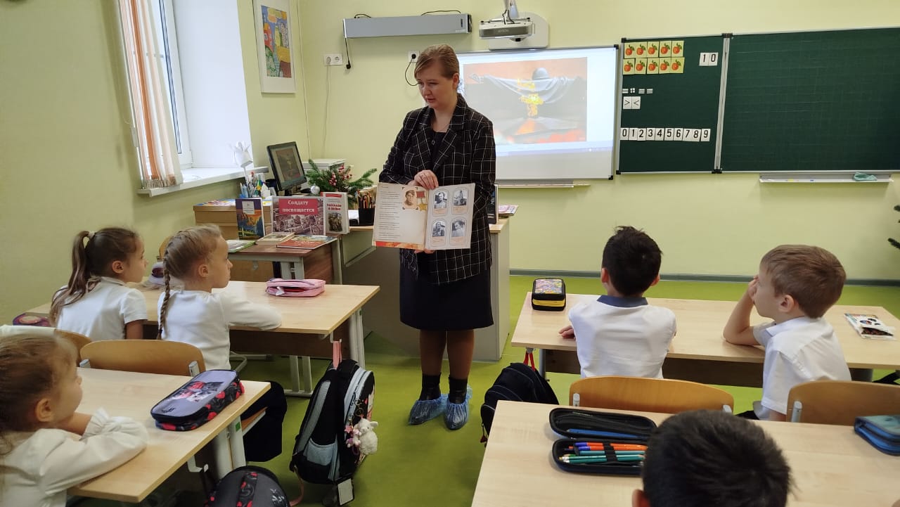 Также в ходе мероприятия библиотекарь познакомила первоклассников со стихами о солдатах времён Великой Отечественной войны, после чего они сами приняли участие в громких чтениях отрывков стихотворений «Сын артиллериста» К. Симонова и «Зинка» Ю. Друниной