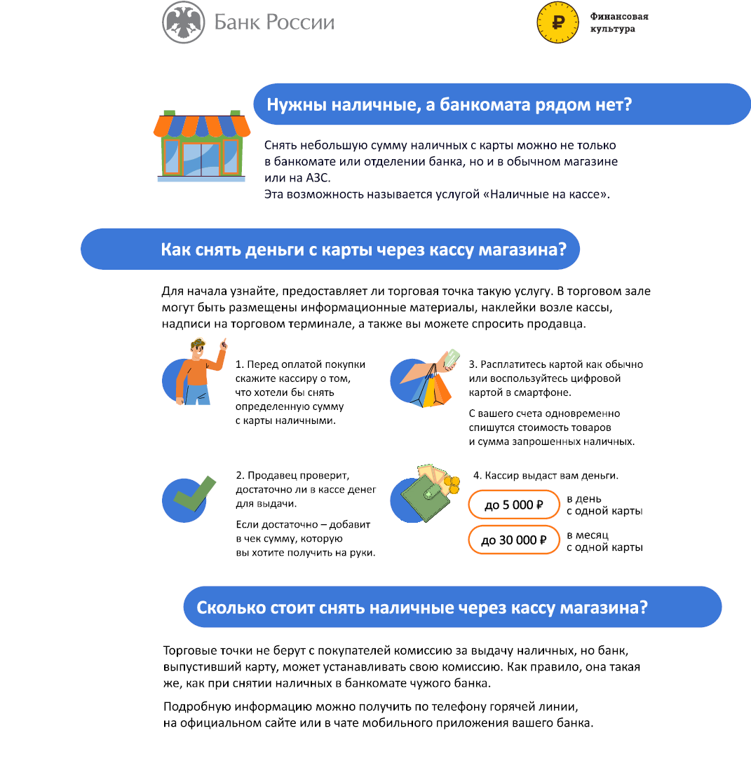 Кэшаут позволяет снимать деньги со своей банковской карты на кассе торговой точки. Правда, просто получить купюры у продавца не получится, необходимо что-то купить и оплатить картой, пусть даже соль или спички. Ведь магазины зарабатывают в первую очередь на продаже товаров, хотя избавиться от лишней налички и сэкономить на инкассации им тоже выгодно.