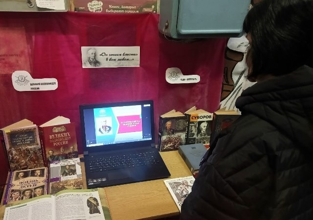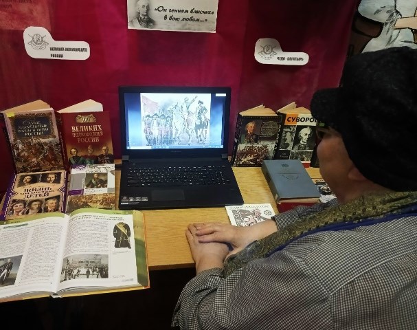 Специалист библиотеки рассказал о значимости этой фигуры в истории России. Затем продемонстрировал одноимённый видеоролик с текстовым сопровождением, где были освещены основные биографические сведения об А. В. Суворове и его боевой путь.