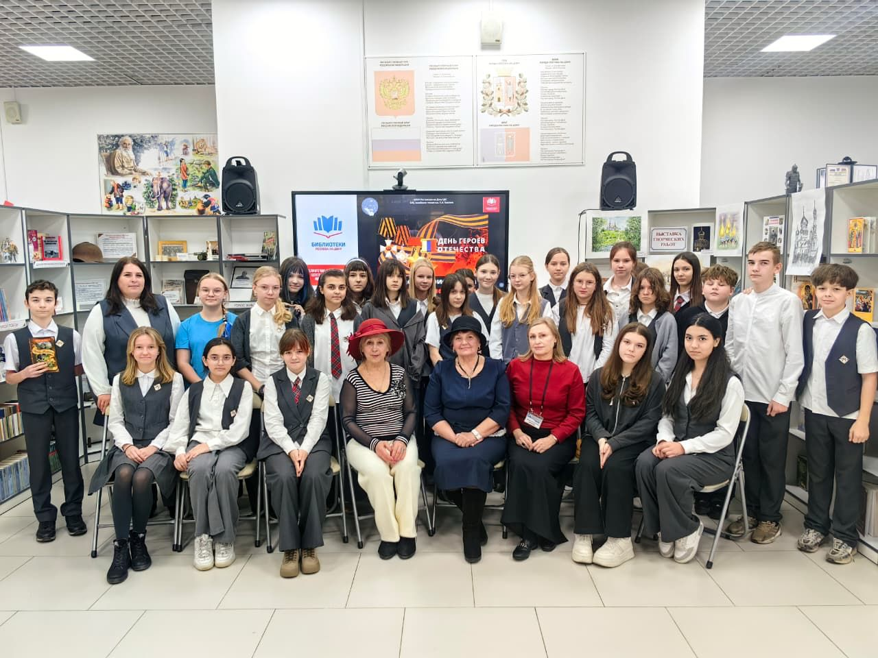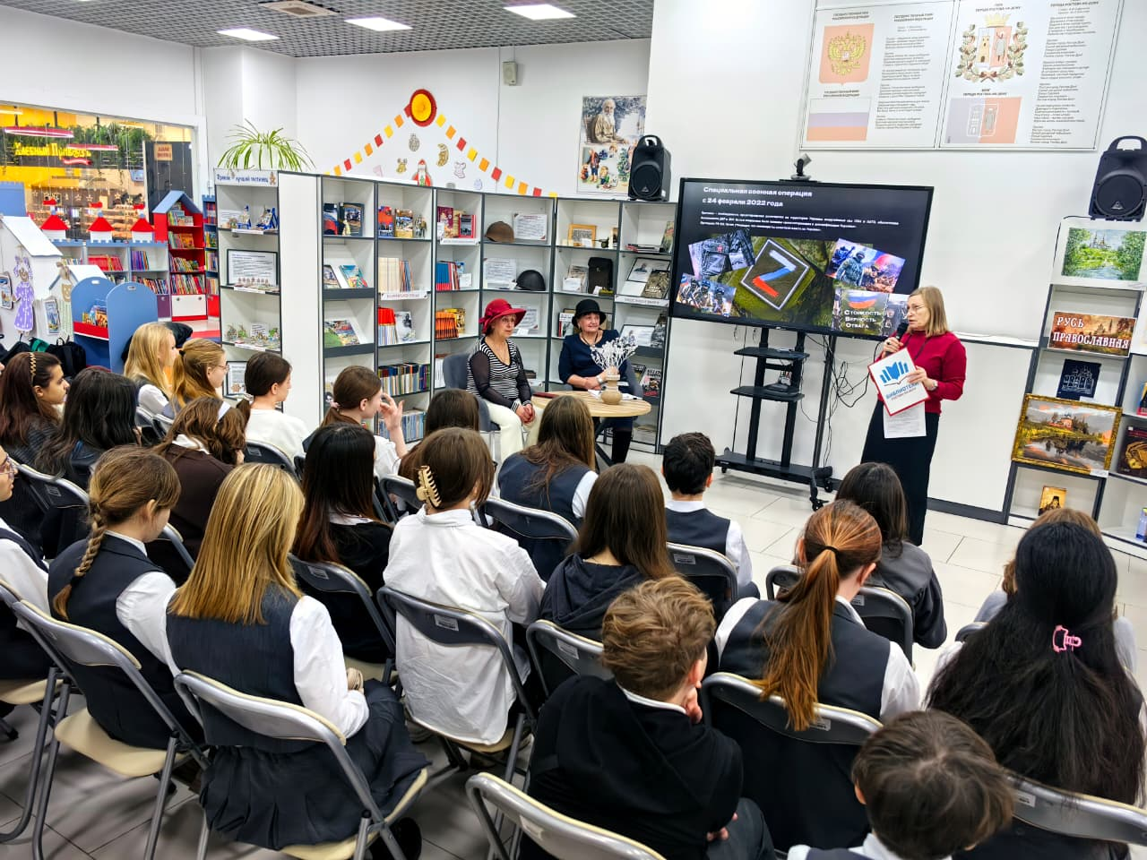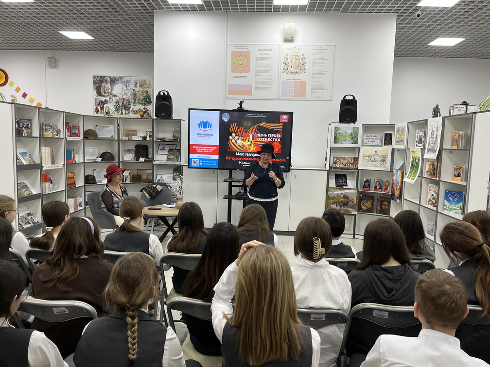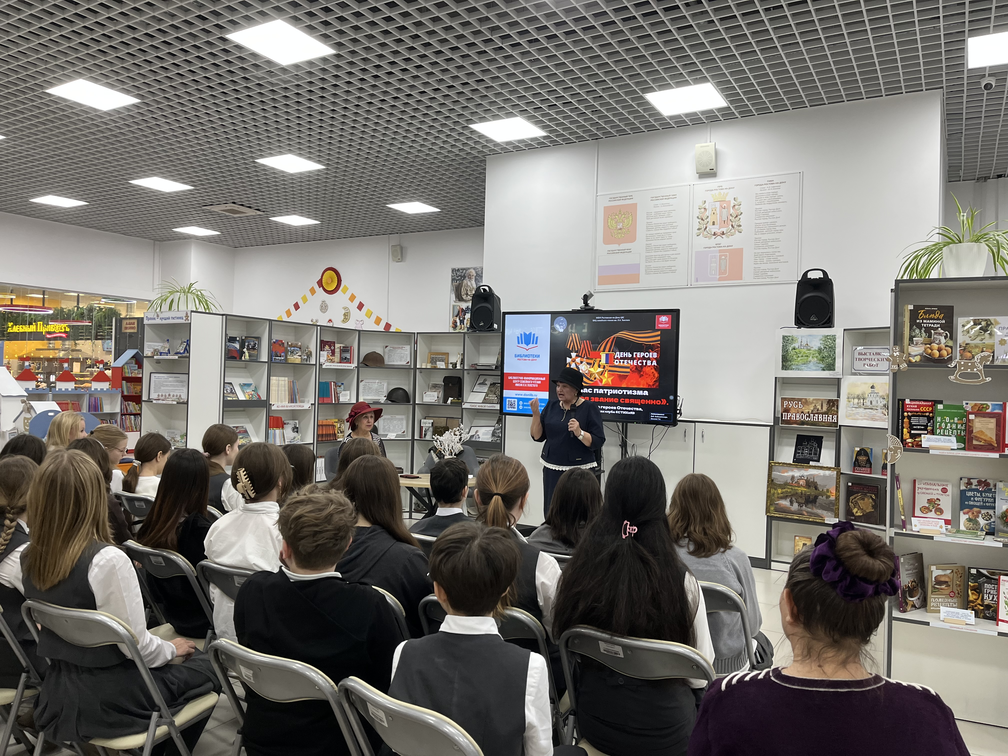 Во вступительном слове библиотекарь познакомила ребят с историей праздника «День героев Отечества». Рассказала о героических подвигах защитников Отечества от Руси - матушки до современности. Особо трогательной была тема СВО, где сегодня на поле боя доблестные сыны России продолжают традиции своих предков по защите рубежей нашей Родины.
