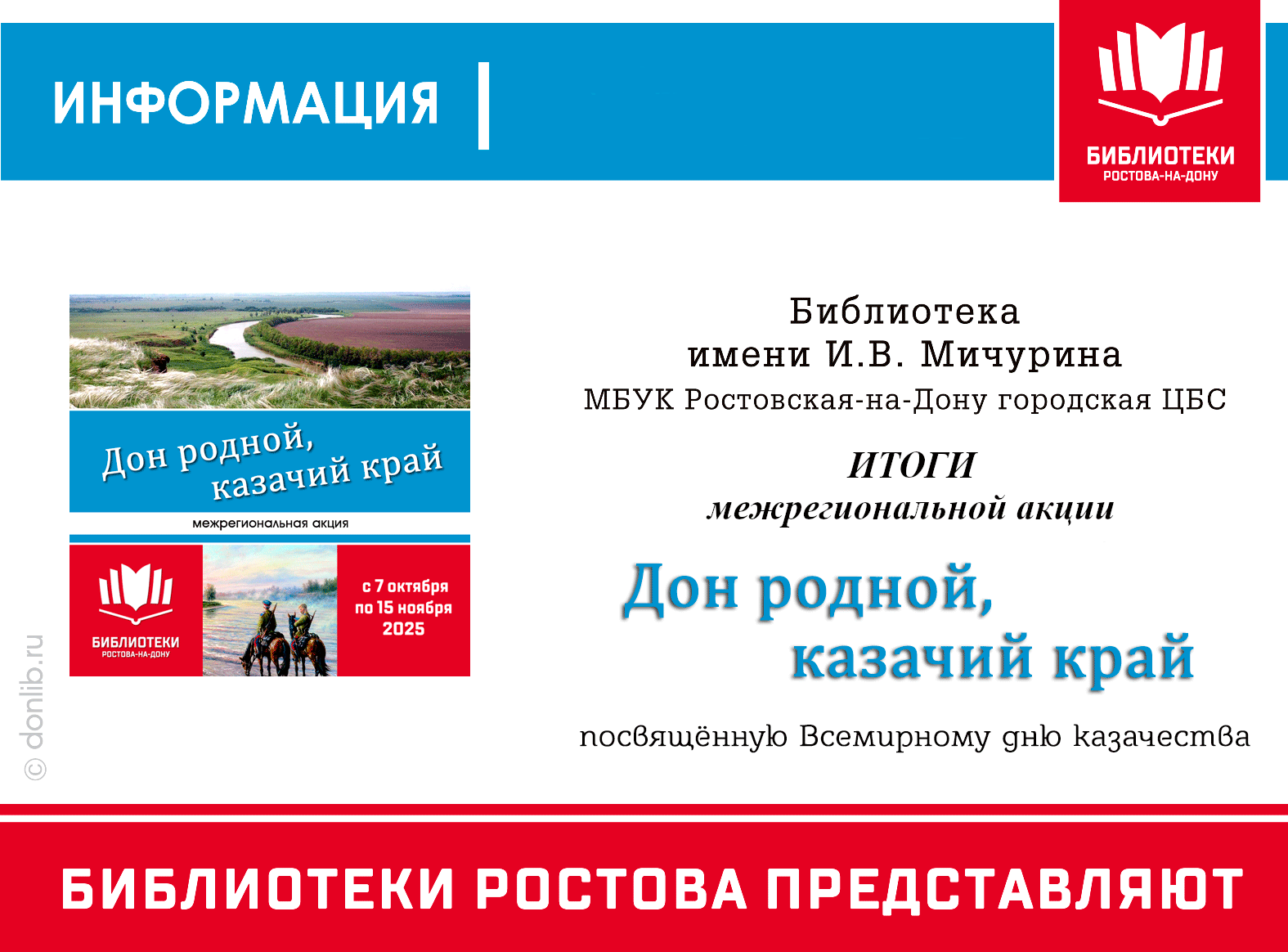 С 7 октября 2025 года по 15 ноября 2025 года специалисты библиотеки имени И. В. Мичурина провели Межрегиональную акцию «Дон родной, казачий край», приуроченную к Всемирному дню казачества. Главной целью акции было популяризация деятельности библиотеки и привлечение внимания к истории Донского края и казачества, традициям и славному прошлому казаков. В акции приняли участие читатели из разных регионов России: Краснодарского края, Московской области, Ростовской области и города Ростова-на-Дону. Среди ...