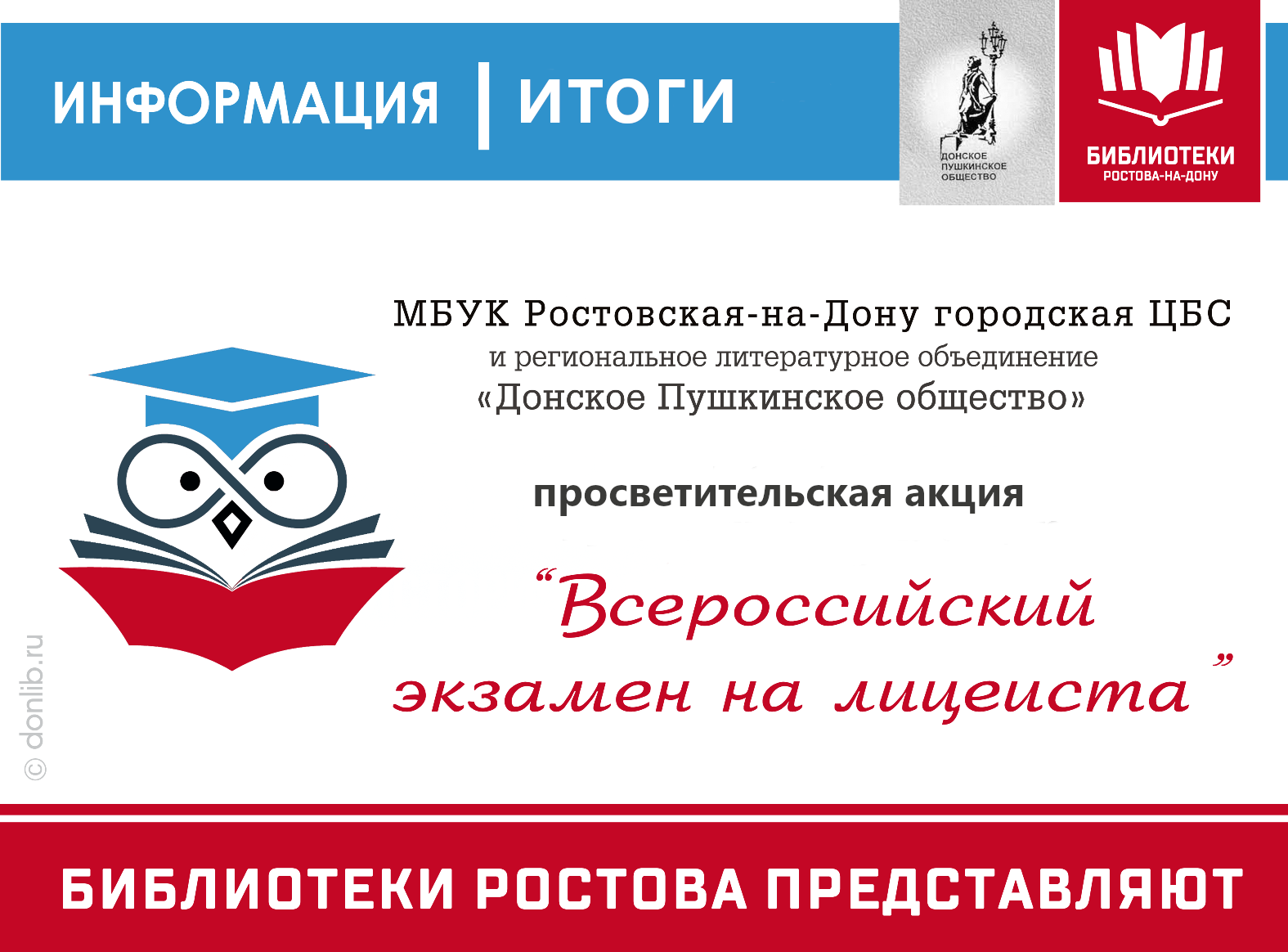 Завершилась просветительская акция четвертый Всероссийский экзамен на лицеиста, организованная модельной детской библиотекой имени А. С. Пушкина Ростовской-на-Дону городской централизованной библиотечной системы при поддержке регионального объединения «Донское Пушкинское общество». Основная цель нашей просветительской акции была – познакомить вас с интересными событиями отечественной истории, культуры и образования, связанными с лицеями и лицеистами в России, дать возможность расширить свой кругозор. Прекрасный ...