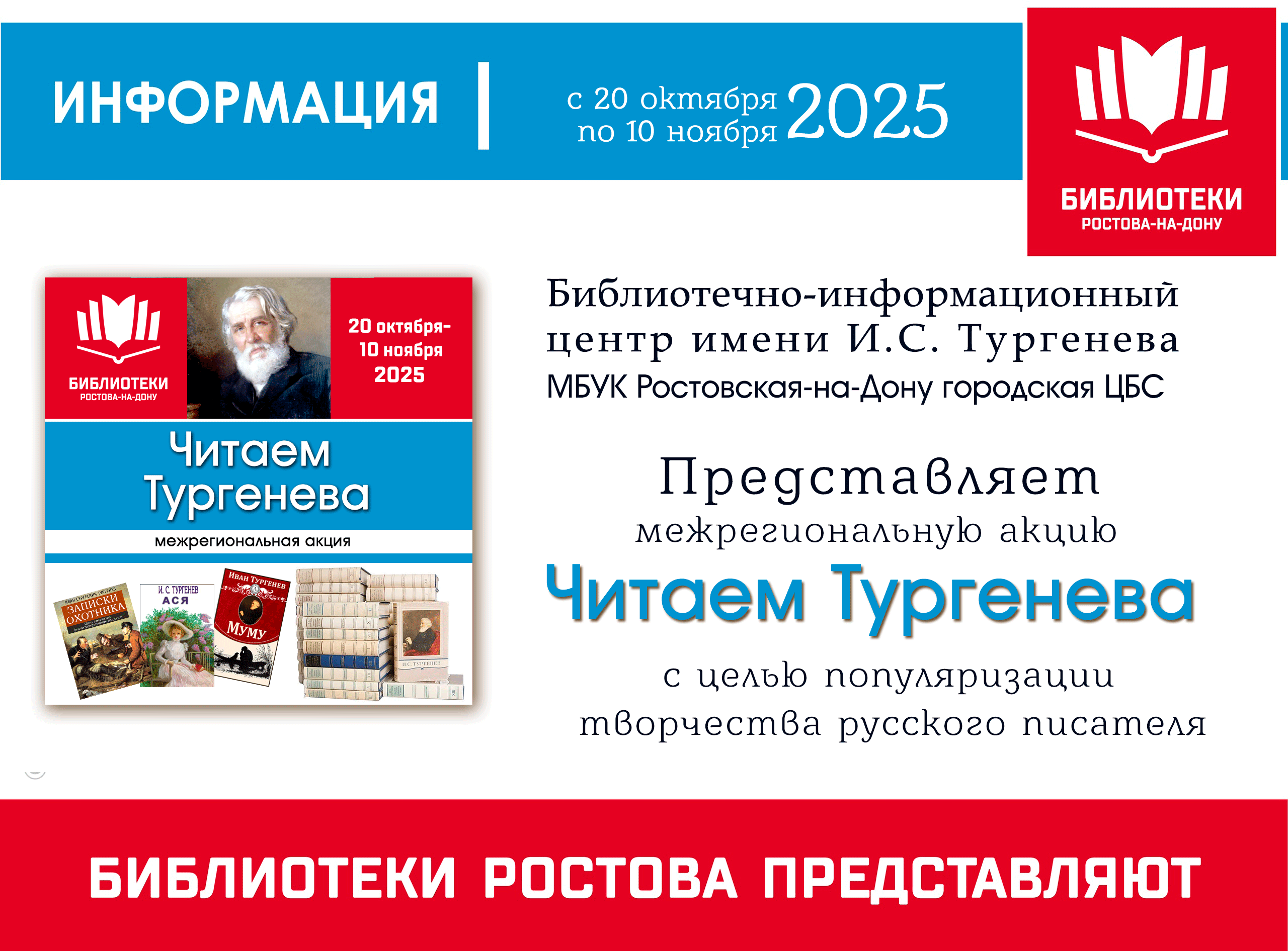 Библиотечно-информационный центр имени И. С. Тургенева приглашает принять участие в межрегиональной акции «Читаем Тургенева». Акция проводится с 20 октября по 10 ноября 2025 года. Для участия в акции необходимо: - стать подписчиком сообщества в социальной сети ВКонтакте «Читаем Тургенева»; - разместить на странице сообщества в социальной сети ВКонтакте «Читаем Тургенева» краткий отчет о проведенном мероприятии (форма мероприятий определяется самостоятельно участниками акции, это могут быть: громкие ...