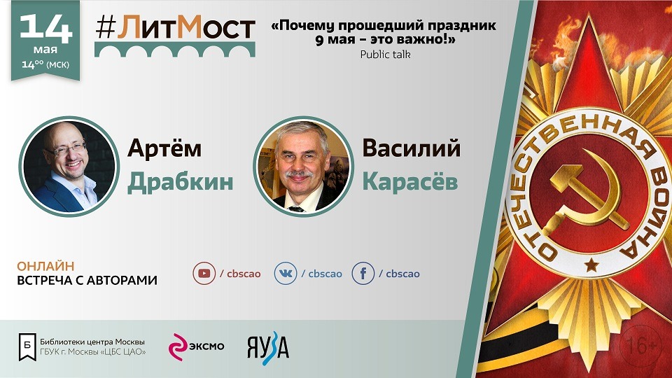 14 мая в 14:00 в рамках издательско-библиотечного проекта «Литмост. Эксмо объединяет» состоится встреча, посвященная 76-й годовщине Дня Победы. О сохранении памяти, героизме и событиях Великой Отечественной войны будут говорить Артем Драбкин, создатель проекта записи интервью участников Великой Отечественной Войны «Я помню», и Василий Карасёв, специалист по боевым действиям на Московском направлении, автор книги «Битва за Клин». Тема встречи: «Почему прошедший праздник 9 мая – это важно!». На мероприятии ...
