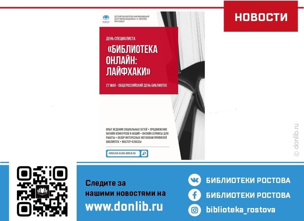 Дорогие друзья! Детский библиотечно-информационный центр имени академика С. П. Королёва МБУК Ростовская-на-Дону городская ЦБС приглашает принять участие в дне специалиста «Библиотека онлайн: лайфхаки», который пройдёт в Общероссийский день библиотек, 27 мая. День специалиста пройдёт на базе нашего блога и будет полезен библиотекарям, библиотекарям-педагогам и специалистам книжного дела. В программе:- мастер-классы по ведению и продвижению страниц в социальныхсетях;- обзор новых библиотечных технологий ...