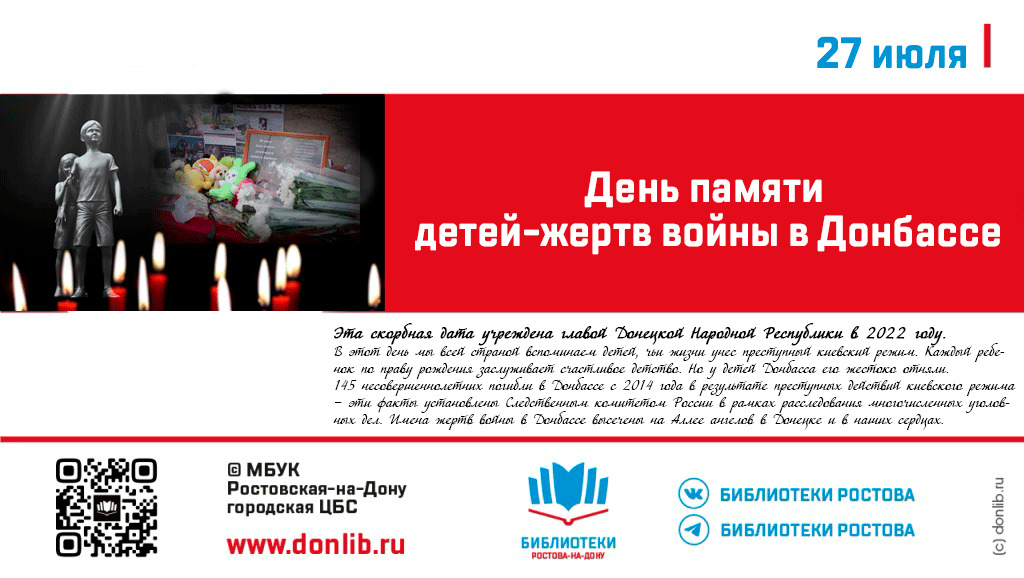 27 июля – День памяти детей-жертв войны на Донбассе. Это скорбная дата, напоминающая о трагических событиях и оставивших незаживающие раны в сердцах многих семей. Этот день посвящен памяти невинных детей, чьи жизни оборвались из-за вооруженного конфликта. Война безжалостна, и дети – самые уязвимые ее жертвы. Они теряют родителей, дома, детство, подвергаются опасности и становятся свидетелями ужасов, которые не должны видеть. Память о погибших детях Донбасса – это напоминание о необходимости мира, ...