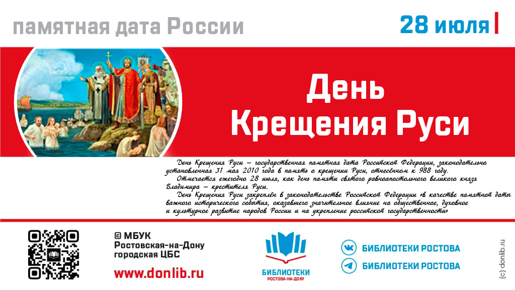 День информации «Крещение Руси Великой» провели специалисты читального зала Центральной городской библиотеке имени М. Горького ко Дню Крещения Руси, который ежегодно празднуется 28 июля. В день информации вниманию читателей была представлена тематическая книжная выставка, посвященная принятию Христианства на Руси (988 год). Библиотекари знакомили читателей с историей праздника, рассказали о житии крестителя Руси - Святого равноапостольного князя Владимира, о причинах принятия христианства на Руси ...
