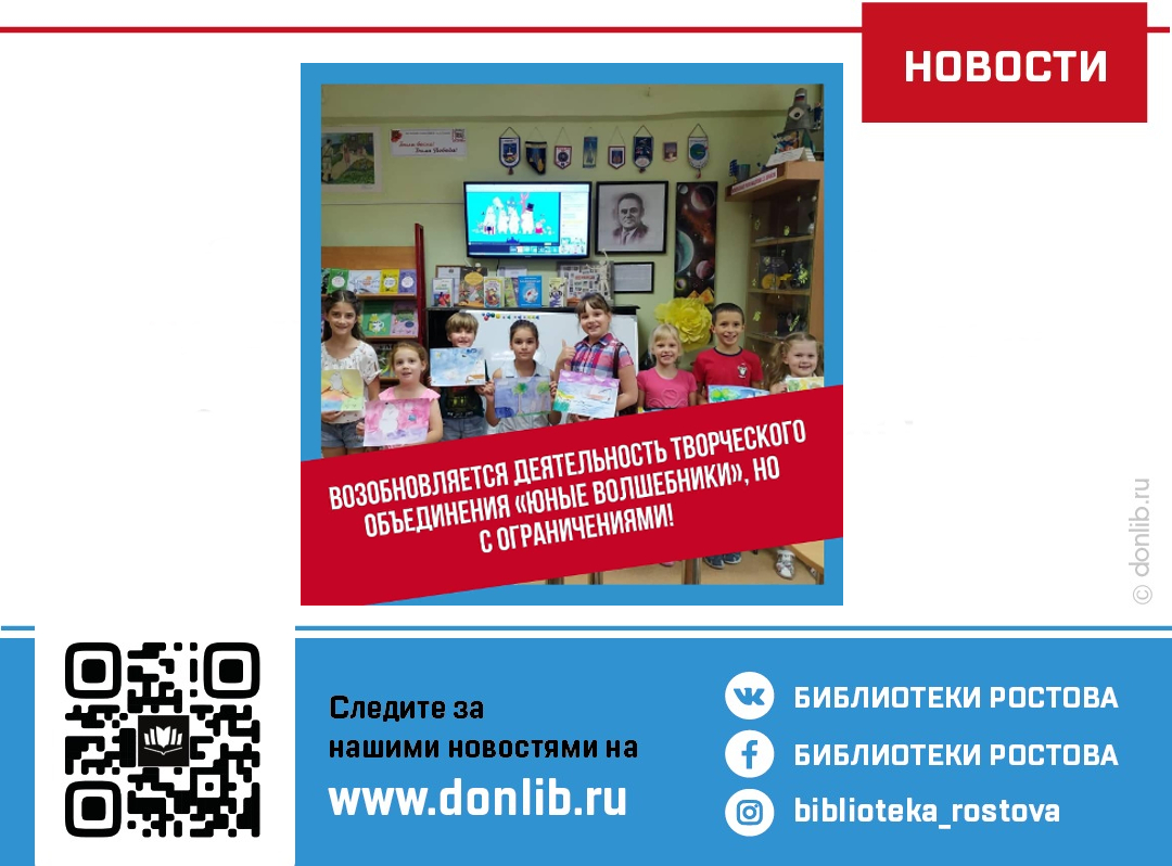 Уважаемые читатели! В соответствии с приказом директора МБУК Ростовская-на-Дону городская ЦБС от 20.07.2020 № 66 в филиалах МБУК Ростовская-на-Дону городская ЦБС возобновляется деятельность клубных формирований и самодеятельного народного творчества. Работа творческого объединения «Юные волшебники» возобновляется, но с ограничениями! В связи с временными правилами, установленными приказом по МБУК Ростовская-на-Дону городская ЦБС от 22.06.2020 № 57 «О возобновлении работы муниципальных библиотек города ...