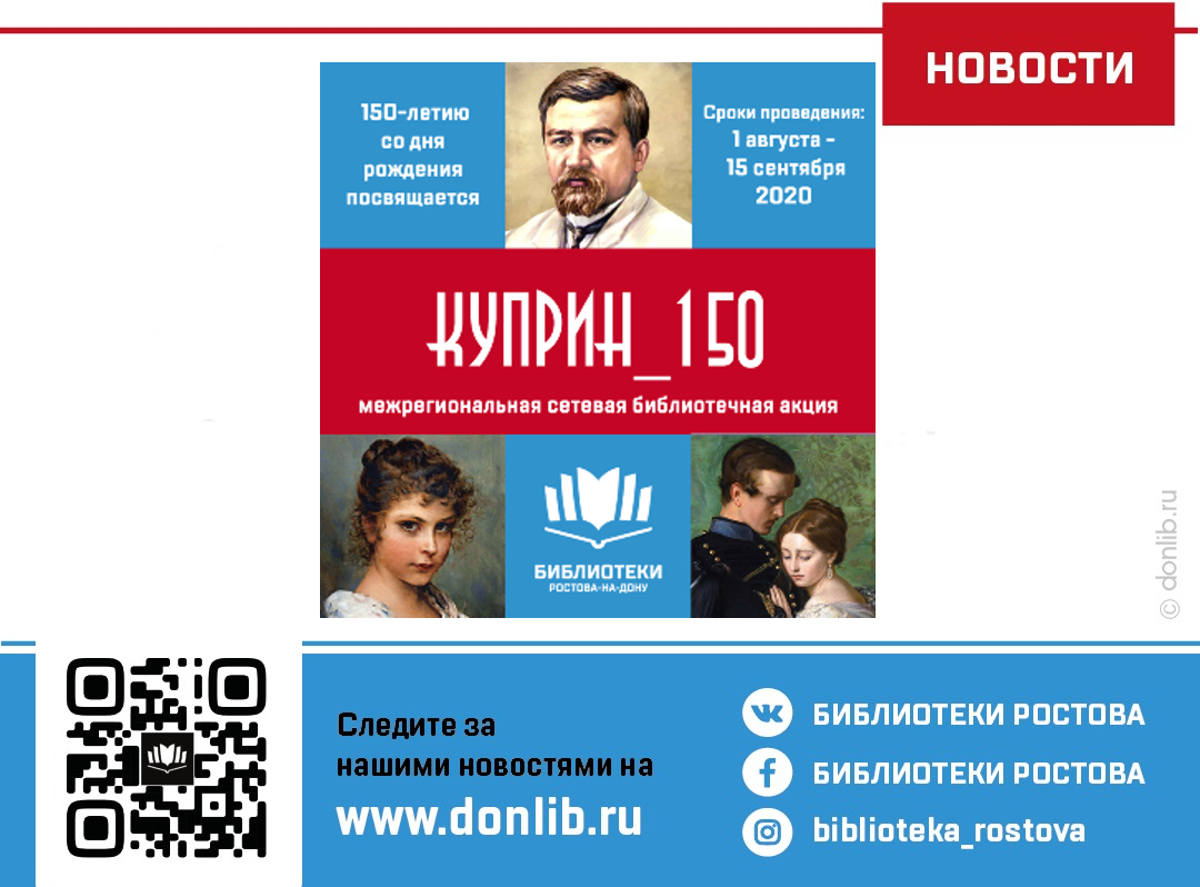 В 2020 году исполняется 150 лет со дня рождения А.И. Куприна, одного из ярких представителей прозаиков нашей страны. Библиотека имени А. И. Куприна МБУК Ростовской-на-Дону городской ЦБС объявляет о проведении Межрегиональной сетевой акции «Куприн_150». Целью Акции является привлечение внимания читателей к литературному наследию замечательного русского писателя А. И. Куприна и активизация библиотек по продвижению лучших образцов отечественной литературы. Приглашаем присоединится к участие в Межрегиональной ...