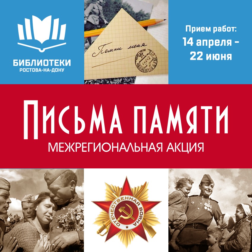 Библиотека имени В.М. Шукшина приглашает присоединиться к библиотечной межрегиональной акции, посвященной 75-летию Победы, «Письма памяти (1941-1945)». Это самое малое, что мы можем сделать в память о тех, кого с нами нет и кто рядом с нами. Все письма, написанные вами, будут опубликованы в блоге Библиотеки имени В.М. Шукшина. Для того, чтобы принять участие в акции вам необходимо написать «письмо», придерживаясь одной из следующих тем: Письмо деду (отцу, маме, бабушке, прадеду и т.д.), всем, кто ...