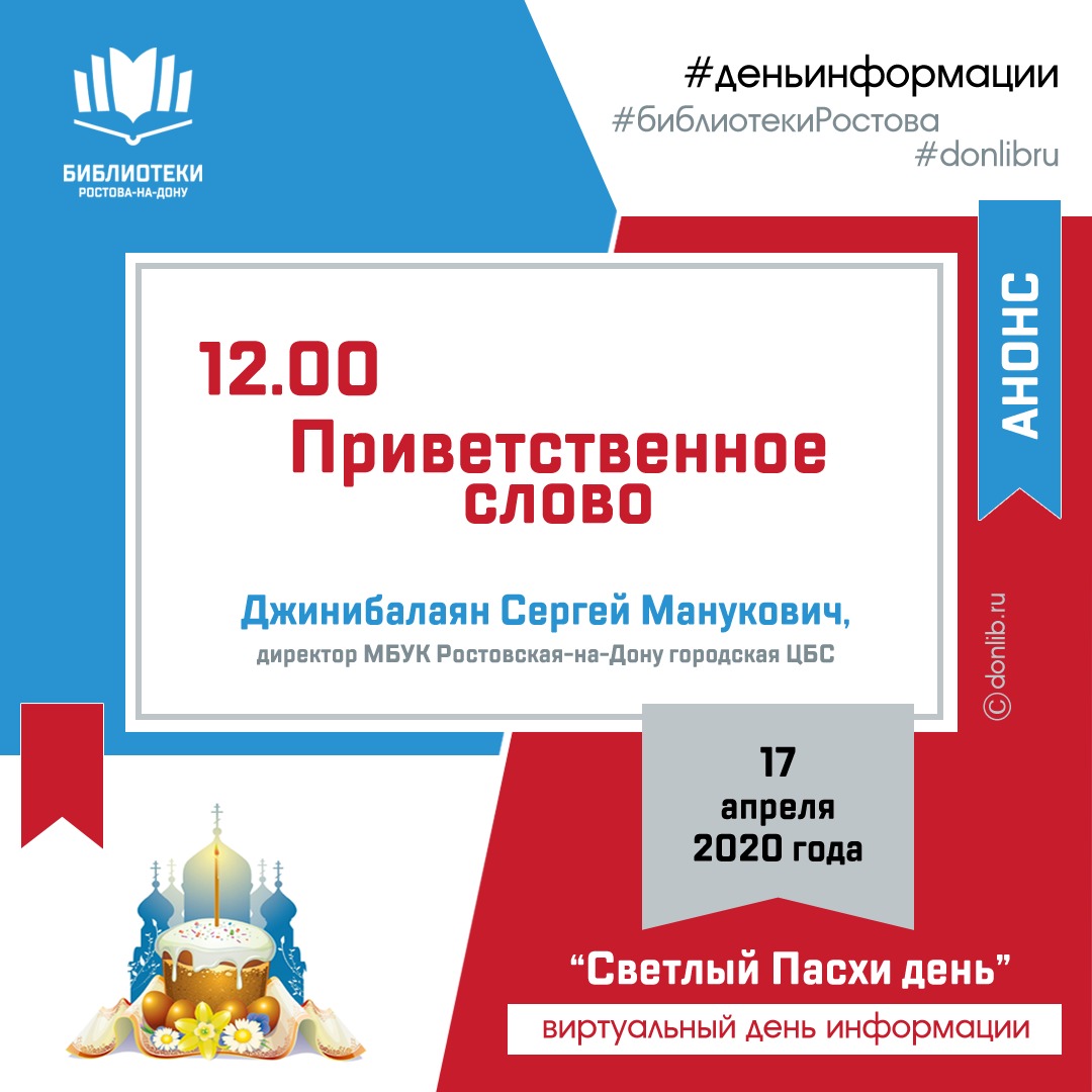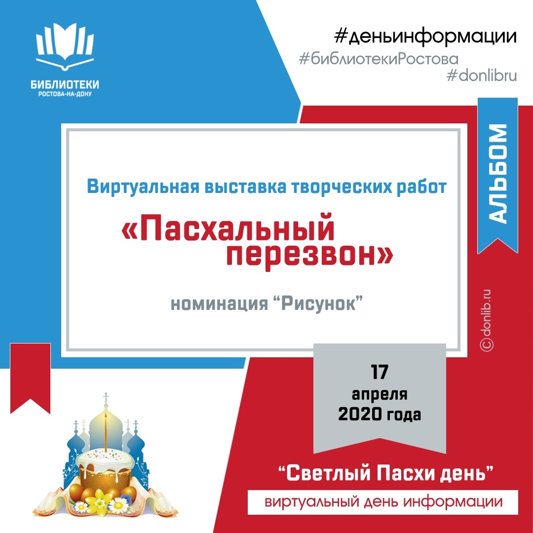 Уважаемые читатели!17 апреля МБУК Ростовская ЦБС на нашей странице в социальной сети «В Контакте» проведет виртуальный день информации. Начало в 12:00. Приветственное слово Джинибалаян Сергея Мануковича директора МБУК Ростовская-на-Дону ЦБС на нашем канале YouTubeВ течении дня для вас онлайн выставки, мастер-классы, обзоры, викторины.Творческие работы, которые наберут наибольшее количество лайков и комментариев, будут отмечены специальными дипломами (в электронном формате). По итогам дня информации ...