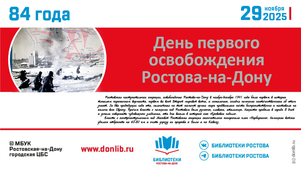 29 ноября 2025 г. – День первого освобождения Ростова-на-Дону от немецко-фашистских захватчиков. День первого освобождения Ростова-на-Дону от немецко-фашистских захватчиков отмечается 29 ноября. В этот день в 1941 году войска 56-й армии и Южного фронта успешно провели штурм и освободили город от немецко-фашистских захватчиков. Это было первое крупное поражение вермахта в Великой Отечественной войне с 1939 года и важный переломный момент, который вдохновил советских бойцов по всей стране. В Библиотеках ...