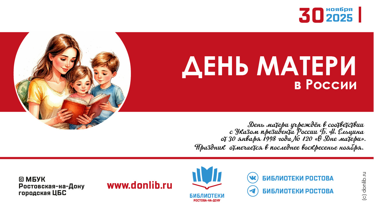 День матери в России отмечается в последнее воскресенье ноября. В 2025 году праздник приходится на 30 ноября. Официально День матери был учрежден Указом Президента РФ № 120 от 30 января 1998 года по инициативе Государственной Думы. Этот день посвящен выражению благодарности и любви матерям за их важную роль в жизни каждого человека. Ко Дню матери в библиотеках Ростова пройдут просветительские мероприятия: 27 ноября 2025 года Музыкально-поэтическая программа «Дорогой мой человек» пройдет в 11:00 в ...